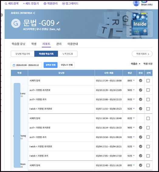 안녕하세요. AES어학원 원장 Brian입니다. AES에서는 학생들의 과제 수행을 단순히 내주는 것으로 끝내지 않고 실제 학습 여부를 꼼꼼히 확인하고 있습니다. 중등부와 고등부 학생들은 클래스카드(Classcard)를 활용한 온라인 문법 학습을 진행하고 있으며, 학생별 문법 학습 현황표를 통해 학습량과 수행 상태를 정기적으로 점검하고 있습니다. 또한 온라인 학습뿐 아니라 ✔ 오프라인 단어 테스트 ✔ 문법·독해 수업 적용 ✔ 정기 레벨 테스트 까지 연결하여 학생들의 학습 과정을 지속적으로 관리하고 있습니다. 앞으로도 학생들이 **성실한 학습 습관을 기를 수 있도록 꼼꼼히 지도하겠습니다. 감사합니다. #AES어학원 #초중고영어학원 #구미....... <img src="https://blogthumb.pstatic.net/MjAyNjAzMTJfMjAw/MDAxNzczMjc4MzUxMTU4.i7xldxH-o03nAOvJBR1ZOPpt1zINpiX1djHTMD_TdvAg.rUjagKCBl28rpVzzWjZG1UYbdZ-0_gPErpacQ5Vwx7Mg.PNG/image.png?type=s3" />