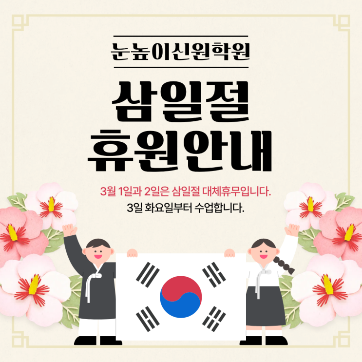 3월 2일은 삼일절 대체휴무일입니다. 3일(화)부터 정상 수업합니다. <img src="https://blogthumb.pstatic.net/MjAyNjAyMjdfMjY0/MDAxNzcyMTcwMzY3NzI5.XDZLR4tOn-xZ6xW_GU4oMu9o9NghPEDMlHF8u2NTRYAg.hmboY0d5d5KF1NlM04cqt7D6iv_c__54qk91HO6gYmsg.PNG/%BB%EF%C0%CF%C0%FD%C8%DE%BF%F8.png?type=s3" />