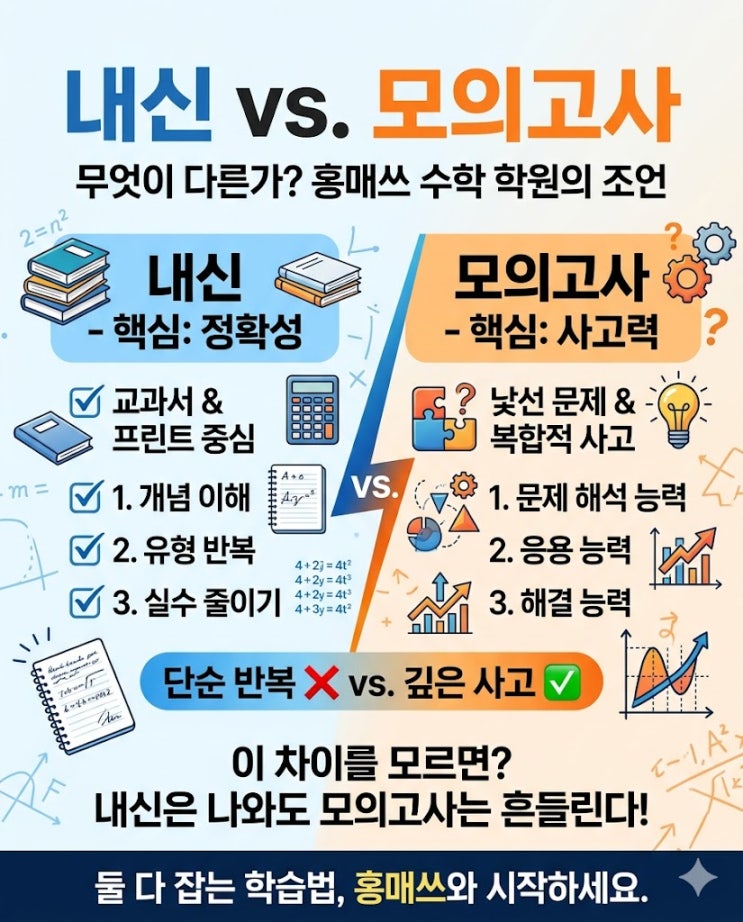 안녕하세요. 본질에 충실하면서도, 철저한 체계 아래 실력을 길러주는 홍매쓰수학학원 서초점입니다. 수학 공부를 하다 보면 이런 고민을 자주 듣게 됩니다. “내신은 괜찮은데 모의고사가 약해요.” “문제는 잘 푸는데 시험만 보면 점수가 안 나와요.” 이 두 시험의 차이를 제대로 이해하지 못하면 공부는 열심히 해도 결과는 기대만큼 나오지 않을 수 있습니다. 서초 수학학원, 홍매쓰수학학원에서 보면 내신과 모의고사는 같은 수학이지만 접근 방식이 전혀 다른 시험입니다. 내신은 ‘정확성’, 모의고사는 ‘사고력’ 중심입니다 홍매쓰수학학원에서 학생들을 지도하다 보면 내신은 교과서와 학교 프린트 중심으로 출제되는 경우가 많습니....... <img src="https://blogthumb.pstatic.net/MjAyNjA0MDFfMjIz/MDAxNzc1MDIxNzU5MTM4.UWHeyJOsMHQaTua-1Z44g8e96YZ0rkjkiifJTqB0K_Eg.4N8Wi3xT2Yjn0zOtvB9NHH3u7O1Hl38vmfpyQo8ohEQg.JPEG/b5c71adf-220a-483c-8835-69100e59ea3f.jpg?type=s3" />