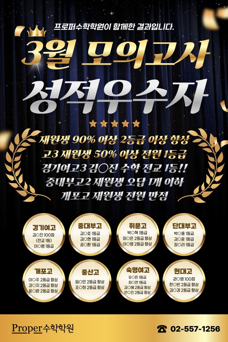 안녕하세요! 프로퍼 수학학원 & 라그랑주 과학학원입니다. 2026년 3월 모의고사에서 우리 학생들이 정말 놀라운 성과를 만들어냈습니다! 오늘은 그 자랑스러운 결과를 여러분께 소개해 드리려고 합니다. 프로퍼 수학학원 재원생 90% 이상 2등급 이상 향상 고3 재원생 50% 이상 전원 1등급 경기여고3 김○진 수학 전교 1등!! 중대부고2 재원생 오답 1개 이하 개포고 재원생 전원 만점 라그랑주 과학학원 재원생 100% 이상 2등급 이상 향상 영동일고2 재원생 전원 만점 중산고 재원생 50% 이상, 1등급 달성 양재고 재원생 만점 ~ 오답 1개 이하 이라는 결과를 기록했습니다.✨ 이번 성과는 학생들의 노력은 물론, 프로퍼 수....... <img src="https://blogthumb.pstatic.net/MjAyNjA0MDVfMjU3/MDAxNzc1Mzc1OTg2OTA4.S-hpvCs-4Kf9F-w2_zXaMqb-VlaClQufxYzubqs6Gy4g.qGi7cm-xiN_mD5dCgtDE1ir5UU1_xIKGxgEMhB8wyBUg.JPEG/001.jpg?type=s3" />
