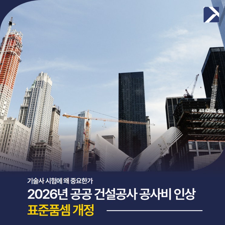 안녕하세요. 기술사 시험의 흐름을 현장과 제도로 함께 읽어가는 사당기술사학원입니다. 2026년을 앞두고 공공 건설공사 기준이 큰 변화를 맞이하고 있습니다. 단순히 “공사비가 오른다”는 뉴스 한 줄로 지나치기에는, 이번 표준품셈·표준시장단가 개정이 기술사 시험과 현장 모두에 던지는 메시지가 분명합니다. 이번 변화는 비용 인상의 문제가 아니라, 그동안 제도 밖에 머물러 있던 ‘현장의 현실’을 공사비에 정식으로 담아내기 시작했다는 점에서 의미가 큽니다. 2026년부터 적용되는 표준시장단가는 전년 대비 평균 2.98% 인상됩니다. 표준시장단가는 실제 공공공사 현장에서 형성된 거래가격을 토대로 산정되는 기준으로, 이후 공공공....... <img src="https://blogthumb.pstatic.net/MjAyNjAxMDVfNzUg/MDAxNzY3NTg3Mjc4NjEx.iK69tLViOjIineuYmVcoiH4N54sjQyWG9RNMpCNH554g.k-it192HvQEgdWXTJom0AiKPl2cDq0bvalME-nvRa3kg.JPEG/260105_%C7%A5%C1%D8%C7%B0%BC%C0_%B0%B3%C1%A4_1.jpg?type=s3" />
