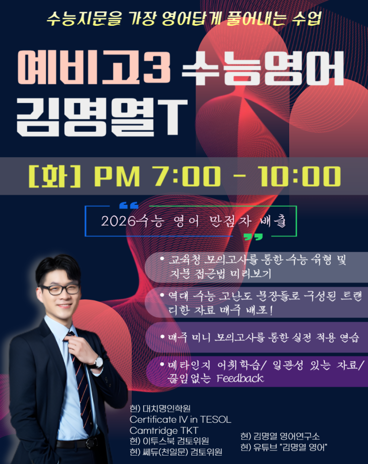 수능지문을 가장 영어답게 풀어내는 수업 예비고3 수능영어 김명열T [화] PM 7:00 - 10:00 [2026 수능 영어 만점자 배출!] 교육청 모의고사를 통한 수능 유형 및 지문 접근법 미리보기 . 역대 수능 고난도 문장들로 구성된 트랜디한 자료 매주 배포! . 매주 미니 모의고사를 통한 실전 적용 연습 . 메타인지 어휘학습 / 일관성 있는 자료 / 끊임없는 Feedback 김명열T 와 함께하면 수능영어 1등급 완성! 대치명인 은평캠퍼스 상담 및 문의 : 02-354-0058 문자전용 : 010-6221-0052 #은평명인학원 #대치명인은평캠퍼스 #수능전문학원 #고3전문학원 #고등전문학원 #고3영어전문학원 #고3영어김명열t #고등영어김명열t #김명열t영어 #김명열t 고3 사....... <img src="https://blogthumb.pstatic.net/MjAyNjAxMjJfMTg2/MDAxNzY5MDUxNjQ2ODM3.sKPfTOJJWWr1pOvow73tR_MUipuFmeyBgOYW19peHkQg.XAn7jE10384VBNINvs41lx24xwyv3DGRz3kpMFHg-ewg.PNG/%B1%E8%B8%ED%BF%ADt_%B0%ED3%BF%B5%BE%EE-001.png?type=s3" />