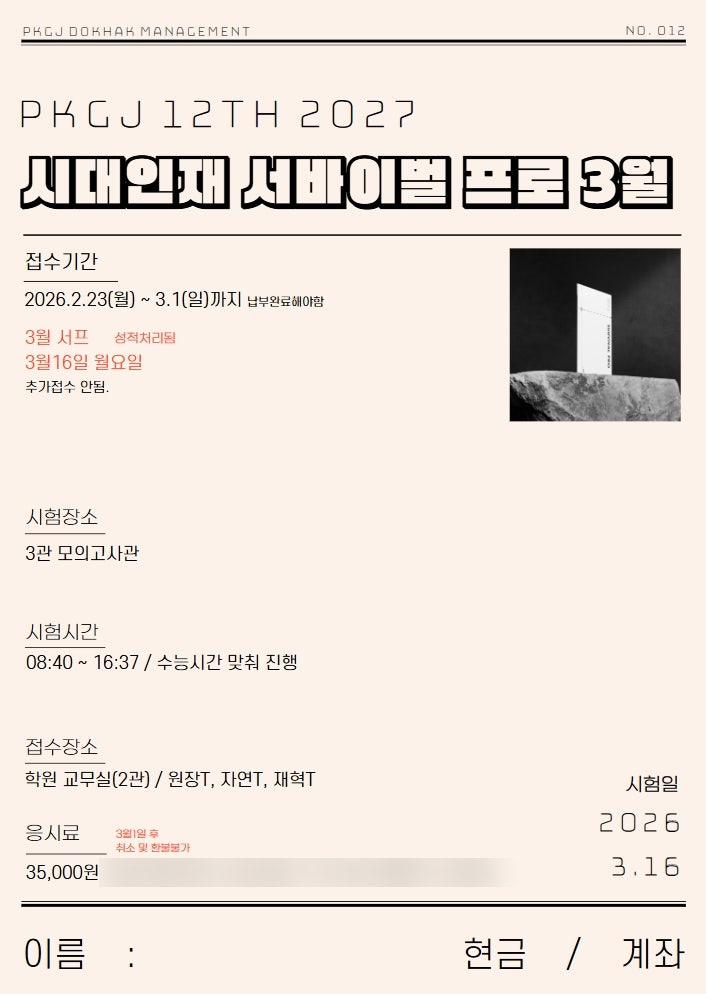 PK독학재수학원 광진본원 시대인재 전국 모의평가 서바이벌 프로 PK독학재수학원 광진본원에서는 작년과 동일하게 시대인재 전국 모의평가 서바이벌 프로를 도입하게 되었습니다. 구성 국어 + 수학 + 영어 + 한국사 + 탐구 전과목 문제지 해설지 개인별 정밀분석 성적표 제공 주요 특징 •평가원 퀄리티 시험지 실제 수능 출제 경향을 반영한 고품질 문항으로 구성 •전국 규모 성적 비교 시대인재 재원생과 전국 고3/N수생이 동시에 응시하며, 성적표와 등급컷, 표준점수 등의 정보 제공 •정밀 분석 & 지원 전략 시대인재 ‘데이터룸’을 통해 수시/정시 분석, 지원 가능 대학 예측, 학습 전략 안내 등 종합적인 내비게이션을 받을 수 있습....... <img src="https://blogthumb.pstatic.net/MjAyNjAyMjdfMzIg/MDAxNzcyMTc0NjU5NjAz.vqxCkVRAkj2hZG_8FPpDsgu6T5PA5Swq3UFvRtgeFW4g.wANx7LY9OYifIpk3SD4PiHM6bL-rQKMFP_6Ct_73hUkg.JPEG/2027_3%BF%F9%BC%AD%C7%C1.jpg?type=s3" />