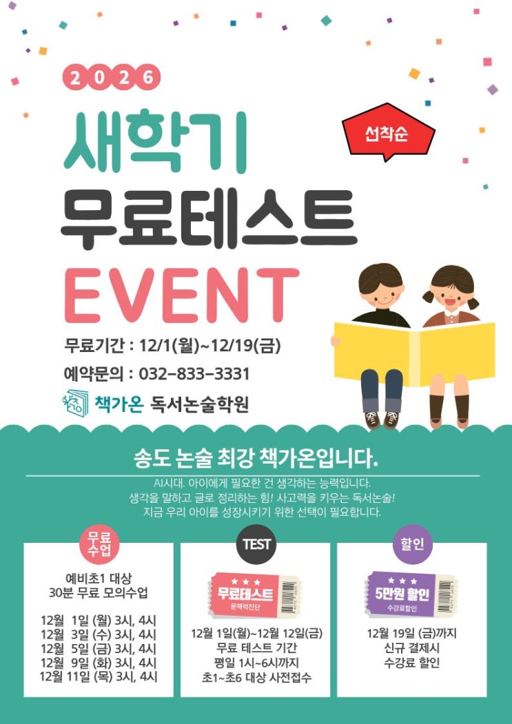 안녕하세요. 책가온 독서논술학원입니다. 신학기 모집 이벤트 안내드립니다. 독서논술 실력, 무료 테스트로 바로 확인하세요! 선착순으로 마감되니 신청을 서둘러 주세요! <img src="https://blogthumb.pstatic.net/MjAyNTExMjRfMjU3/MDAxNzYzOTc4OTUyNjI4.iaUPW8_xnsNCm8NsN9M5NcaPlCH1lFV4MrSlBFCZFDMg.ZnBazEF0yE-s80ug79K-lLE1ldn0kfbNFNRAt0_r1rIg.JPEG/2025%B3%E2_12%BF%F9_%C0%CC%BA%A5%C6%AE_%283%29.jpg?type=s3" />