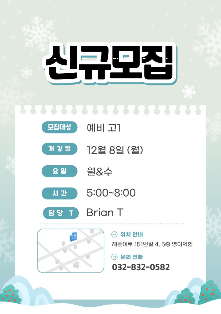 안녕하세요 송도 영어의힘 학원입니다. 중학교 3학년 학생들의 마지막 시험이 끝나고 본격적으로 예비 고등을 준비해야하는 시기에 접어들었습니다. 이와 관련하여 12월 8일(월)에 신규개강하는 예비 고1반 안내해드리겠습니다. 12월 8일 (월) 신규개강 대상: 예비 고1 요일&시간: 월/수 (주2회) 5:00~8:00 독해-고1&고2 독해 기출 (학원 자체 교재) 어법-어법끝 START & 실력다지기 어휘-워드마스터 수능2000 & 고등Complete 듣기-마더텅 기출 담당선생님: Brian T -25년 1학기 송도고 합산 전교 1등 배출 -25년 1학기 연송고 1등급 배출 -25년 1학기 해송고 100등대 > 2학기 중간고사 40등대 특이사항) -정규수업 이외에 보....... <img src="https://blogthumb.pstatic.net/MjAyNTEyMDFfMjEy/MDAxNzY0NjAwMjMxMDE2.OrdlEoMSip9gHzdGFEYHTSVOfJ31oTysSl48UR1JfGsg.BUKXuir4ph2zj31_rdAlW1JOgv9xmg_UoZXpDKbDEfIg.JPEG/%C1%A6%B8%F1%C0%BB_%C0%D4%B7%C2%C7%D8%C1%D6%BC%BC%BF%E4.jpg?type=s3" />
