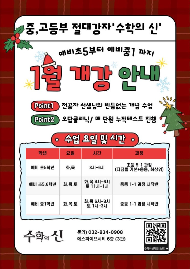 안녕하세요~ 내신과 수능의 절대강자 수학의 신 학원입니다. 학부모님들의 많은 문의가 있었던 예비초 5(현 초4)~ 예비중 1(현 초6)까지 1월 개강이 확정되었습니다. 그동안 기다려 주셔서 감사합니다. ✅ 전공자 선생님과 함께하는 탄탄한 개념 수업부터 심화까지 완벽하게!! ✅ 오답 클리닉과 매 단원 누적 테스트로 완전 학습 시스템!! 지금의 선택이 중·고등 상위권의 출발점이 됩니다. 12월 등록 학생은 수학의 신 오답 노트를 제공합니다.(선착순 모집마감) 상담문의 | 3관 032)834-0908 수학의신3관:학원에스파이브시티 B동 6층 #초4수학 #초5수학학원#예비중1수학#5공구수학학원#에스파이브시티수학학원#5공구수학의신#첨....... <img src="https://blogthumb.pstatic.net/MjAyNTEyMDhfMTc1/MDAxNzY1MTkzNzYwODM2.f2DDOX0mdTl50vOtNdrhFg0d9NQUyW0-Y0S3bMoKYBog.CCImYH4zQlslV0LSU3M6s7b-4zLwf8pYKpG5F9mro38g.JPEG/1765193745905.jpg?type=s3" />