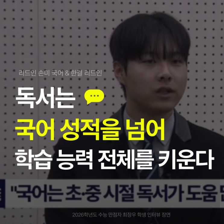 책읽기와 공부의 상관 관계 독서는 ‘국어 성적’을 넘어 학습 능력 전체를 키운다 최근 한 수능 국어 만점자 인터뷰 에서 이런 말이 나왔습니다. “국어는 초·중 시절 독서가 정말 많이 도움이 돼요.” 이 말은 단지 국어 과목에만 해당되는 것이 아닙니다. 책 읽기는 모든 공부의 기본 체력을 만들어주고, 학생의 전 과목 성적과 ‘학습 효율’까지 결정짓는 핵심 활동입니다. 왜 독서가 이렇게 큰 힘을 가지는지, 그리고 왜 리드인 손미 국어가 ‘맞춤형 독서 프로그램’을 강조하는지 조금 더 깊게 풀어볼게요. https://www.youtube.com/watch?v=FFRgwdTYd40 1. 독서는 모든 과목의 ‘기초 체력’을 만든다 ✔ 독해력은 모든....... <img src="https://blogthumb.pstatic.net/MjAyNTEyMDhfNzcg/MDAxNzY1MjAxMDk5NjMw.dCcm4kchUcI5frovqR_L1TZ1FnE9Cd4aasAcxgtsOmAg.0liAEPjp9fbSeD_avnRSvMiEeYEAZWZ6MDDHVzHWpQUg.PNG/%C7%FC%B1%A4%BB%F6%B0%FA_%C8%F2%BB%F6_%BD%C9%C7%C3%C7%CF%B0%ED_%B4%DC%BC%F8%C7%D1_%BB%E7%C1%F8_%B9%E8%B0%E6_SNS_%BA%ED%B7%CE%B1%D7_%C4%AB%B5%E5%B4%BA%BD%BA_%BD%E6%B3%D7%C0%CF_%C0%CE%BD%BA%C5%B8%B1%D7%B7%A5_%C6%F7%BD%BA%C6%AE.png?type=s3" />
