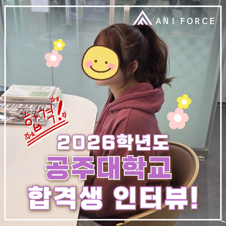 항상 즐겁게 그림 그릴 수 있도록 지도하는 수원애니포스가 되겠습니다. 안녕하세요~ 수원 애니포스 만화학원입니다! 2026 "공주대학교" 게임디자인과 수시 최초 합격한 박시O학생의 합격 인터뷰를 준비했습니다! (생생한 합격 후기 함께 보실까요~^^) 박시O 학생 합격자 인터뷰 합격 소감은? = 실기 준비 기간이 짧다 보니까 수시 합격에 대한 큰 기대를 가지지 않았습니다. 하지만 정말 가고 싶었던 공주대학교에 합격 소식을 받아서 “어? 내가 합격했다고?”라는 생각이 먼저 들었고, 실기 시험을보러 공주대에 갔을 때 캠퍼스가 너무 좋았던 기억이 있었는데 제가 다니게 된다고 생각하니 기뻤습니다. 전공과 그 학교를 지원....... <img src="https://blogthumb.pstatic.net/MjAyNTEyMjRfNDkg/MDAxNzY2NTc2MDY4Mzg0.7P9G4APapBJOPvrvvSAXPywwvzX_BGV1H4zroAGYAJsg.35KcsJirh4r01WjOHCp-SxEqXOQ6IMwajULg164VOigg.JPEG/%BC%F6%BF%F8-%C7%D0%BF%F8%C0%CF%BB%F3%C6%ED_%BA%B9%BB%E7%BA%BB-006_%286%29.jpg?type=s3" />