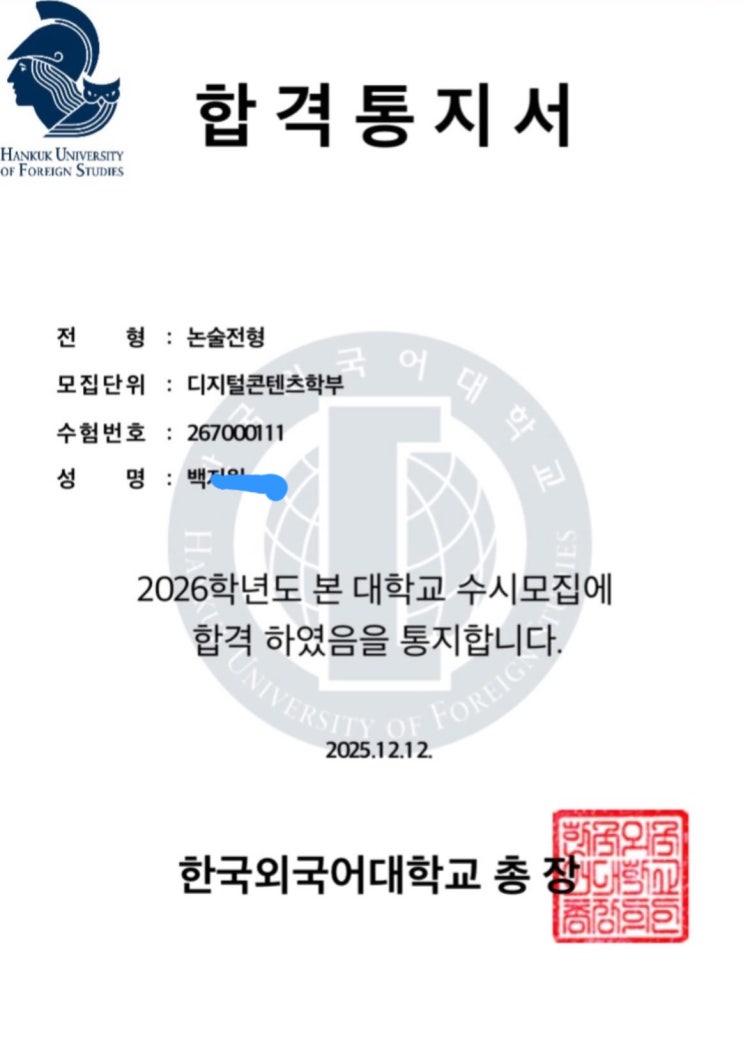 논술전형으로 26학년도 한국외대 디지털콘텐츠학부에 최초합격합격했어요