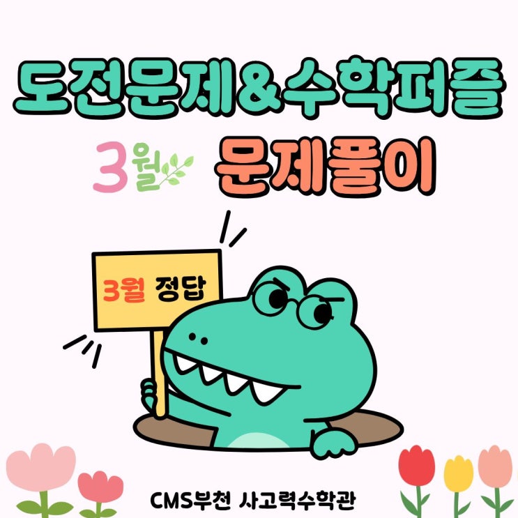 안녕하세요. CMS 사고력수학관 부천쌤입니다. 3월 도전문제 및 수학퍼즐 문제해결 답안을 제공해 드립니다. 본인이 문제해결을 잘 했는지 확인해 보시기 바랍니다. 학원등록 번호 : 5532호 교습비 안내 <img src="https://blogthumb.pstatic.net/MjAyNjA0MDJfMTUg/MDAxNzc1MTAwOTY4NTE5.aJLfYIx2S98STAz4nbLlYJjDKXRl5gao2KfpFH1Xz2sg.mvIYsv_Q6GYB_sVldwC9qNs0k-CECk_Utm4LGhjE0v8g.JPEG/%B5%B5%C0%FC%B9%AE%C1%A6%C7%AE%C0%CC.jpg?type=s3" />