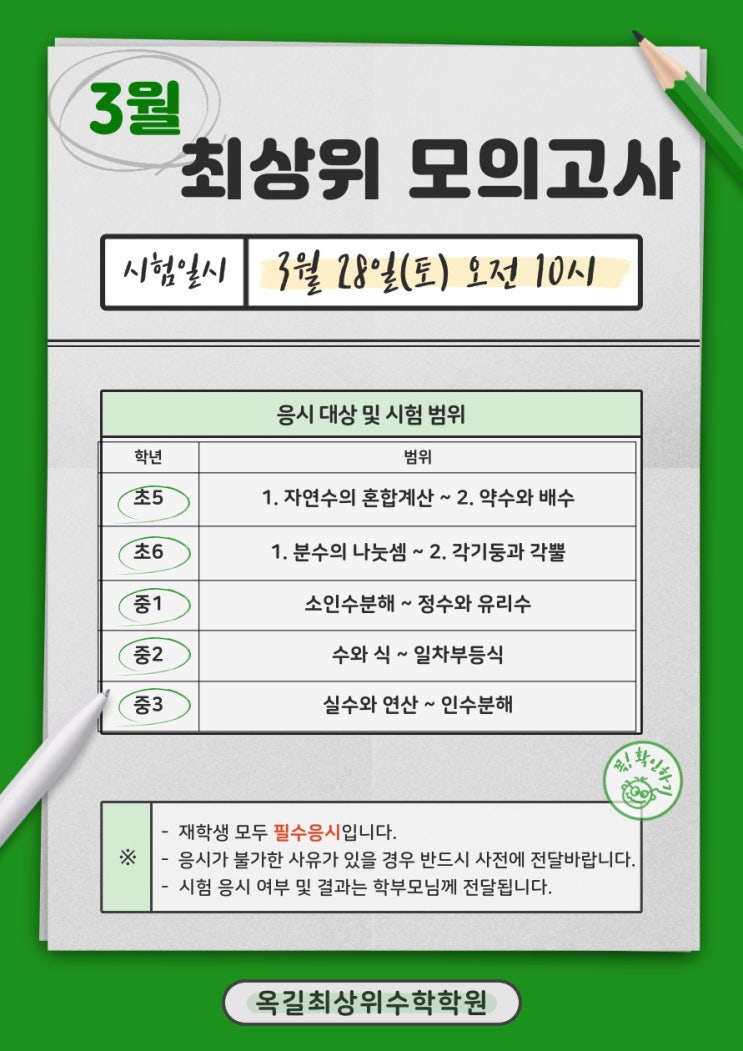 안녕하세요 최상위수학입니다 자체 월말평가 [3월 최상위 모의고사] 일정 및 시험 범위 안내드립니다. <3월 최상위 모의고사> [최상위 모의고사]는 매달 (3)4번째 주 토요일에 실시됩니다. (*학교 시험 및 학원 일정에 따라 변경될 수 있습니다.) 응시대상은 초/중학생이며 시험 범위는 각 학년의 현행 진도에 맞춰 출제됩니다. 시험에 관한 내용(일시,시험 범위 등)은 원내 게시판을 참고해주세요~! 재학생 모두 필수로 응시해야하며 개인 일정으로 인해 응시가 어려울 경우 담당 선생님에게 사전에 전달부탁드립니다. 학생들은, 정해진 시험 시간에 맞춰 문제를 풀며 시험 분위기에 익숙해지는 연습을 할 수 있고 현행 진도에 맞춰 학습....... <img src="https://blogthumb.pstatic.net/MjAyNjA0MDJfMjk0/MDAxNzc1MTA4MTAwMzEw.PSrnGJoe-pMqT2jb5EgG_yUpfgsnl8pH0iV3GHD6lWkg.iCcYmB-BJkAQrTe6uwagFCynusi-RV1tUo4dFHrvomkg.JPEG/%C1%A6%B8%F1%C0%BB-%C0%D4%B7%C2%C7%D8%C1%D6%BC%BC%BF%E4_-004.jpg?type=s3" />