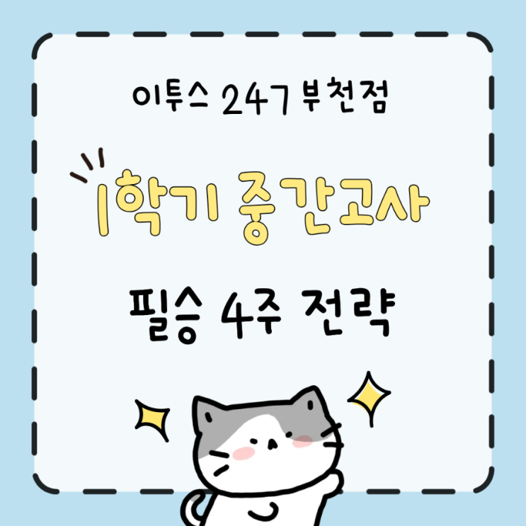 안녕하세요. 이투스 247 부천점입니다. 새 학기가 시작되고 어느덧 중간고사의 계절이 성큼 다가왔는데요! 첫 시험에서 얻은 자신감은 기말고사뿐 아니라 학년 전체를 이끌 학습 동력이 되는 만큼 중요하겠죠? 그렇기에 고등학교 입학 후 첫 시험을 치르는 1학년부터 본격적인 입시 궤도에 오른 2, 3학년 모두 첫 중간고사를 철저하게 준비하여 원하는 목표를 달성하기 위한 출발점으로 삼아야 합니다. 그래서 오늘 중간고사 필승 4주 전략을 소개해드리려고 합니다! 시험 3주 전 본격적으로 내신 대비에 몰입해야 하는 시험 3주 전은 과목별 시험 범위를 명확히 파악하고 구체적인 실행 계획을 수립해야 하는 골든타임인데요. 이 시기에는 무엇....... <img src="https://blogthumb.pstatic.net/MjAyNjAzMzFfMTY4/MDAxNzc0OTMwNDQyMDcy.jLSmi--ZQWgZZzTtE39xVzamflSceilhDNURHHEVlcIg.PkbtQGVapJ2mxYy2tpIgwIu8LCdEEw7kAtN5wipD8LEg.PNG/900%A3%DF%C1%A6%B8%F1%C0%BB_%C0%D4%B7%C2%C7%D8%C1%D6%BC%BC%BF%E4..png?type=s3" />