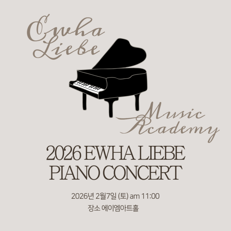 안녕하세요. 평택 고덕동에 위치한 이화리베음악학원입니다. 아이들의 음악 성장을 가장 가까이에서 지켜볼 수 있는 순간, 바로 정기연주회 준비 과정이 아닐까 합니다. 이화리베음악학원에서는 2026년을 맞아 제1회 정기연주회를 준비하며 연주회에 참여하는 학생들의 프로필 촬영과 포스터 제작을 진행했습니다. 2026 이화리베 피아노 콘서트 이번 연주회는 아이들이 그동안 쌓아온 연습과 노력을 무대 위에서 온전히 표현하는 자리입니다. 공연명 : 2026 EWHA LIEBE PIANO CONCERT 일시 : 2026년 2월 7일(토) 오전 11시 장소 : 에이엠아트홀 주관 : 이화리베음악학원 모차르트, 베토벤, 쇼팽 등 클래식 음악의 흐름을 대표하는 작곡가들....... <img src="https://blogthumb.pstatic.net/MjAyNjAxMjJfMTU3/MDAxNzY5MDQ4NzEyNjEz.cOmRaoeiuThRnjnh_cx20dDkh9h5LpGPR2wOabhmGN8g.ovodzwulH9ycUrVy4wD6ptUxGdanc-1In_236W3DuxMg.PNG/%C1%A6%B8%F1%C0%BB_%C0%D4%B7%C2%C7%D8%C1%D6%BC%BC%BF%E4_-001_%2836%29.png?type=s3" />