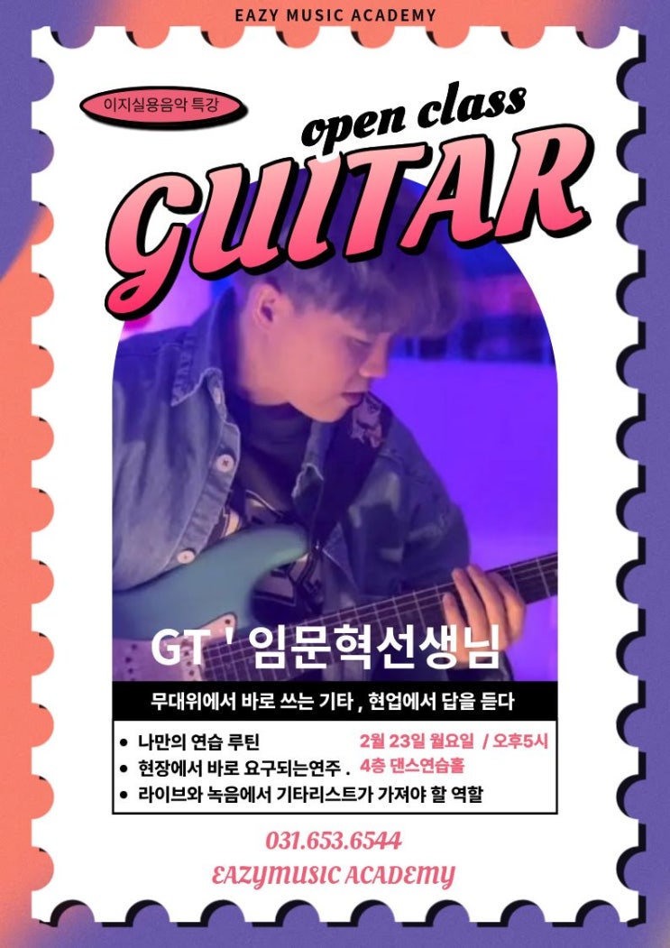 겨울방학특강 오픈클래스 안내 현업 세션 기타리스트와 함께하는 리얼 기타 클래스 안녕하세요~ 이지실용음악학원입니다! 겨울방학을 맞아 기타 전공생, 그리고 기타에 관심이 있는 친구들을 위한 겨울방학 특별 오픈클래스를 진행합니다. 이번 오픈클래스에는 다양한 라이브·레코딩 현장에서 활동 중인 기타리스트 임문혁 선생님을 초청했습니다. ⸻ 초청 강사 | 임문혁 기타리스트 • ♩ 호원대학교 실용음악과 기타 전공 졸업 (한상원 · 정수욱 · 김정배 교수님 사사) • ♩ 아이유 라이브 세션 기타 • ♩ 스윗소로우 라이브 세션 기타 • ♩ V.O.S 라이브 세션 기타 • ♩ 한국 컴패션 화요모임 기타 • ♩ U (Feat. 한보나) 모노....... <img src="https://blogthumb.pstatic.net/MjAyNjAxMjZfMzAg/MDAxNzY5NDE2NjIyNjI3.xxivir8bYmKijmVFh3rVNw6Q9YMQPdgHhyDKfuuzOp4g.zGZUvmnwX5KyiOQEizWZCfultjgyZT_cL7W03IfjI2Mg.JPEG/%C1%A6%B8%F1%C0%BB_%C0%D4%B7%C2%C7%D8%C1%D6%BC%BC%BF%E4..jpg?type=s3" />