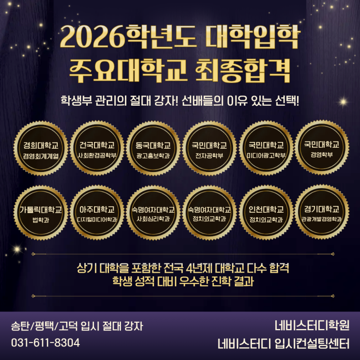 송탄 평택 고덕 국영수 내신대비 수능최저대비 입시전문학원 입시컨설팅 생기부관리 입시지도 전문 네비스터디 체계적인 생기부 관리와 전문성 있는 면접지도, 철저한 개별 학습관리가 이뤄낸 네비스터디의 2026학년도 대학입시 결과 주요대학교 최종합격! 눈에 보이는 합격이라는 단어보다 더욱 감사한건 열심히 생기부 챙기며, 내신 챙기며, 누구보다 열심히 따라줬던 아이들의 노력이 결실을 맺었다는 것! 그리고 선생님 덕분이라고 말해줘서, 아이들을 향한 진심어린 고민의 시간들을 알아주는 듯 해 더욱 감사하고 감사한 소식들이었어요. 위에 표기된 주요대학교 외에도 내신 4.2등급이 순천향대 서류 100전형 합격 3.9등급이 경기대 서류....... <img src="https://blogthumb.pstatic.net/MjAyNjAxMjdfMjAw/MDAxNzY5NTEwMDQ1NjA4.irXpoab9C1LxLRoeGLEnQO3gNyihVYfRx-4pNpbNW-Eg.N29u7nJv-j2auz3_iAjQgUZqtz6Ul3HW6Y9EJl_T0iAg.PNG/2026%B4%EB%C0%D4.png?type=s3" />