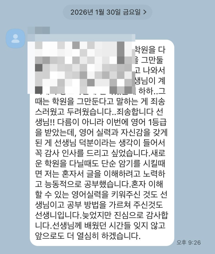 사람의 인연은 칼로 무 자르듯이 한 번에 단절되는 것이 아니란다 이렇게 시간이 한 참 지난뒤에 마음을 전해주니 너무 고맙구나! #지축포인트영어 제대로 배워서 영어쟁이가 되자! 배워본 학생은 아는 #포인트영어 배우신 학부모 선택 #포인트영어 어딘가 나 보다 더 훌륭한 선생님들이 있겠지만 나를 기억해 주고 그 마음을 전해줘서 너무 고맙다. 27년도 수능영어 1등급 소식을 전해줘~! <img src="https://blogthumb.pstatic.net/MjAyNjAyMDFfMjk2/MDAxNzY5OTIyMDI1OTM3.nBUEfeerWAN0EQt3tukHNSSRr8caXrhBIu10JUAfrIEg.yG0nsSO_AkBfv-hUwHwKBgqm6bMI-i9n0hOrIcPhlNQg.JPEG/P20260130_224359414_99C2092F-B414-4E95-9A5B-7BBF7CFBCC5F.JPG?type=s3" />