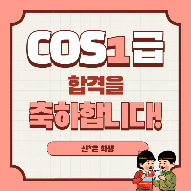 안녕하세요! 두잉창의코딩 고양입니다! 오늘은 무려 자격증 중에서도 많이 어려운 1급 자격증 합격 소식입니다~!! 창릉초등학교 6학년 신*윤 학생이 COS 1급 스크래치 자격시험을 고득점으로 합격했다는 소식입니다. 축하합니다~!! YBM에서 주관하는 COS 자격시험은 스크래치 또는 엔트리를 활용한 블록코딩 자격증으로, 높은 수준의 프로그래밍 능력이 있음을 증명할 수 있습니다. 특히 COS 1급 시험은 그중에서도 가장 어려운 시험이며, 기본적인 프로그래밍 구현 뿐만 아니라 소스코드 검토 및 디버깅, 순서도 분석, 정렬 및 탐색 등 고난이도 알고리즘까지 이해할 수 있어야 합격할 수 있는 시험입니다. 신*윤 학생은 블록코딩 정규과정을 공....... <img src="https://blogthumb.pstatic.net/MjAyNjAyMDRfNjkg/MDAxNzcwMTkwMDUzMDAw.kdscsV2dMxEmOK7Tc4CVNTue3jOlHi8t_ISvEfx7xEgg.oc46XiFW7quk1WUZyayx_tfxa84eoVcfomkqCxfN4q8g.PNG/COS-1%B1%DE-%C7%D5%B0%DD-001.png?type=s3" />