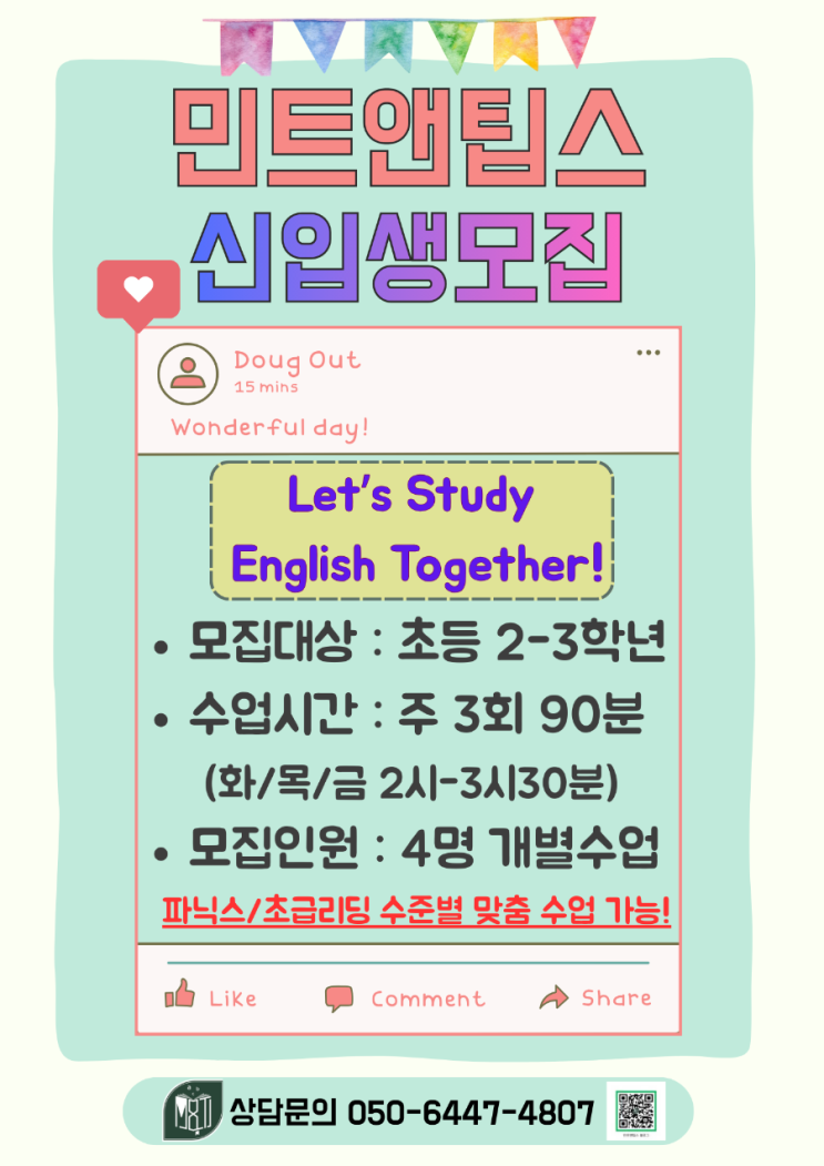 안녕하세요! 민트앤팁스에서 초등 2-3학년 대상 신입생을 모집합니다. 초/중/고 민트앤팁스의 자세한 커리큘럼은 아래 글 참고 부탁드립니다. ⬇️⬇️⬇️⬇️⬇️ https://m.blog.naver.com/goformina/223189190968 이번 신입생 모집은 파닉스/초급 리딩을 학생 수준에 맞춰 1:1 개별수업할 수 있는 시간으로, 총 4명 모집합니다. 요일 및 시간은 화/목/금 2시~3시 30분!! 민트쌤들과 즐겁고 확실한 영어공부 해볼까요? 초/중/고 영어학습의 길잡이 민트앤팁스 상담문의 050-6447-4807 (수업 중 통화가 어려울 수 있습니다) 위 번호로 문자 남겨주시면 수업이 끝난 후 연락드립니다 #신원동영어학원 #민트앤팁스 #신입생모집 #파닉스 #초급리딩....... <img src="https://blogthumb.pstatic.net/MjAyNjAyMDdfMjE3/MDAxNzcwNDI2NDY5MDQ2.LB5RL1b6-rr4qc3uKhfSUFfpbo2n5VJMtqqLjefJuC8g.xGx8R8CRh_RbFesvpHDiEOMLC6Y8Rb92Z7y8C1FfX8cg.PNG/900%A3%DF1769927170049.png?type=s3" />