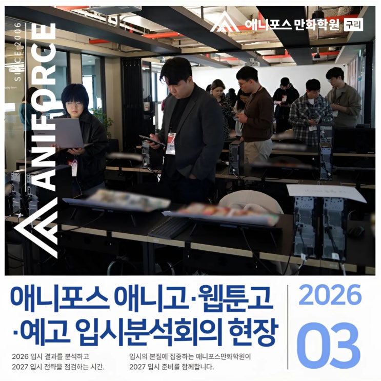 안녕하세요! 꿈을 그리는 한국애니고/예고 전문 구리 애니포스 만화학원입니다. 오늘은 지난 3월 23일, 대치 애니포스에서 진행된 '2026 애니포스 전국 캠퍼스 입시분석회의'의 뜨거웠던 현장 소식과 함께 앞으로의 입시 방향성을 정리해 드리려해요~! 2026 애니고·웹툰고·예고 입시의 정점, 분석회의 현장 만화와 애니메이션, 게임 전공을 희망하는 학생들에게 가장 중요한 것은 변화하는 입시의 흐름을 정확히 읽어내는 것입니다. 이를 위해 전국의 애니포스 원장단과 강사진이 한자리에 모였느데요 이번 회의는 단순한 정보 공유를 넘어 실제 합격생들의 재현작을 세밀하게 해부하며 '합격의 기준'을 다시금 정립하는 시....... <img src="https://blogthumb.pstatic.net/MjAyNjA0MDFfMSAg/MDAxNzc1MDQ3NDEyMjkx.flAPNaXntUzToB3lRR2i9s5J_XEV5Zv26L25HVdb6vIg.g4rsAnzgVx3lNg_GX1wSqccxtHcwQuq_CTbbBobPPR4g.JPEG/%C1%A6%B8%F1%C0%BB_%C0%D4%B7%C2%C7%D8%C1%D6%BC%BC%BF%E4_-001_%283%29.jpg?type=s3" />