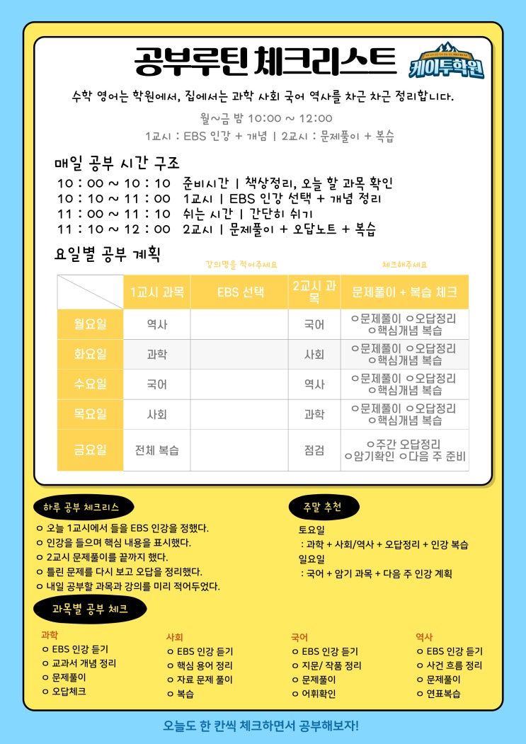 시험기간 '집공'이 막막한 너에게 - 케이투학원 공부 루틴 체크리스트 나눔 [인창동 영어학원] [인창동 수학학원]