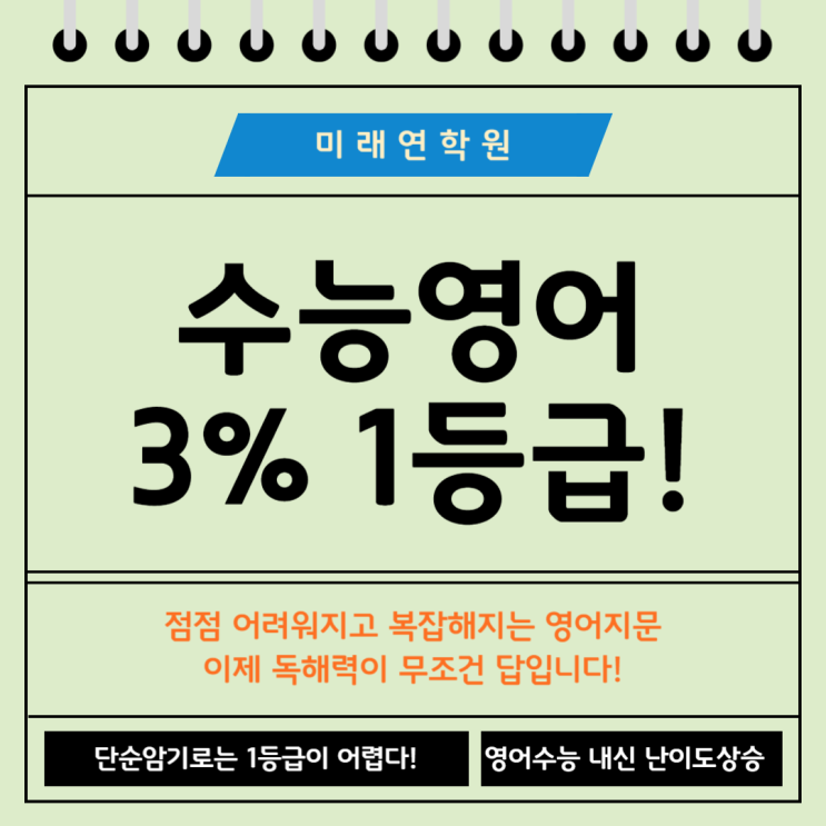 안녕하세요 미래연학원입니다! 학부모님, 작년 수능 영어 1등급 비율이 단 3%대에 불과했다는 내용을 알고 계신가요? 평소보다 절반 이하로 뚝 떨어진 수치에 많은 분이 큰 충격에 빠지셨을 겁니다. "우리 아이는 단어도 열심히 외우고 문제도 많이 푸는데 왜 점수가 이 모양일까?"라며 답답해하시죠. 하지만 냉정하게 말씀드리면, 이제 영어는 단순히 단어를 많이 외운다고 점수가 나오는 암기 과목이 아닙니다. 문제의 핵심은 아이들이 문장을 '읽는 법' 자체를 모른다는 데 있습니다. 현재 대다수 학생은 영어를 거꾸로 배우고 있습니다. 단어장에 적힌 뜻만 기계적으로 외우고, 문장 해석은 대충 아는 단어 몇 개를 조합....... <img src="https://blogthumb.pstatic.net/MjAyNjAzMjlfOTUg/MDAxNzc0NzcyMDMyMDkz.R_zWjcgM_3u6SUeb_4oklWqsFvadsxtQvIrgXvOC1PMg.bkMOiMww-CJ0IQWdplJWoiEV4PwfrsJYCPTYze-cJwIg.PNG/%C1%A6%B8%F1%C0%BB_%C0%D4%B7%C2%C7%D8%C1%D6%BC%BC%BF%E4_-001_%287%29.png?type=s3" />