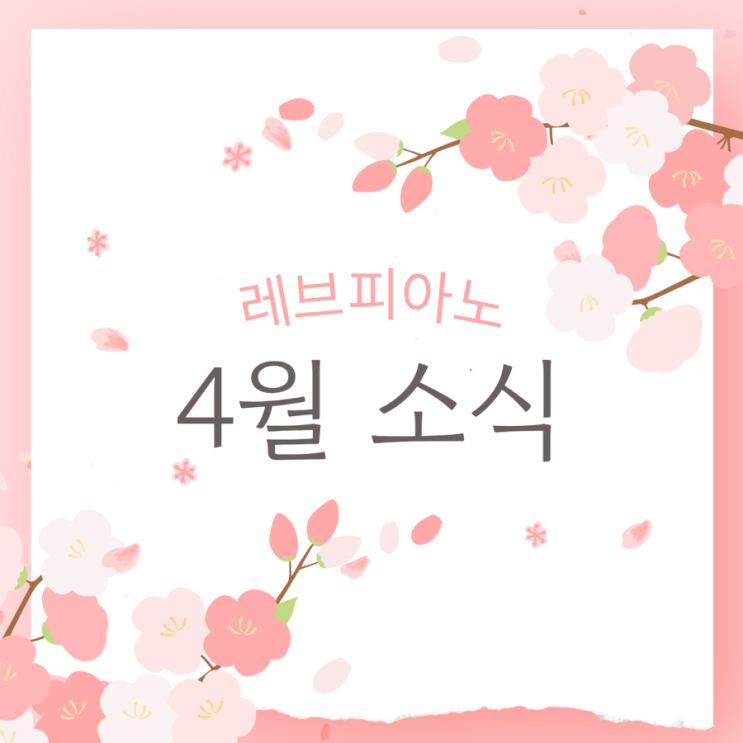 안녕하세요 레브피아노입니다. 따뜻한 봄기운이 완연해지는 4월입니다! 길가에 봄꽃이 피어나고 있는데요. 잠깐의 산책으로도 예쁜 꽃들 보며 큰 힐링을 얻네요☺️ 바쁜 일상 속에서도 잠시 여유를 가지며, 소중한 순간들을 놓치지 않는 한 달이 되셨으면 합니다. 4월 특강 4월에는 퀴즈 특강을 진행할 예정입니다. 리듬치기, 셈여림, 음악기호 등 그동안 배웠던 이론 총 집합! 퀴즈를 많이 맞힐수록 선물도 많이 받아갈 수 있답니다~~ 남은 2주동안 열심히 공부해보자 애들아~ 땡! 퀴즈 틀리면 연습실 들어가서 한 곡 치고 나오기 4월 영상촬영 4/24 영상 촬영 후 마지막주에 피드백과 함께 보내드립니다! 3월~4월 미션 레브피....... <img src="https://blogthumb.pstatic.net/MjAyNjAzMzFfNSAg/MDAxNzc0OTIyNzc4MDE0.zWWNtHlFb-BOYcUeyoErwDm0nrV27B5QC2PeIXA9wrUg.piQLiKlCavP68idNR_bvElwNEojf4SD2ugIoSme7pYsg.PNG/IMG%A3%DF8764.PNG?type=s3" />