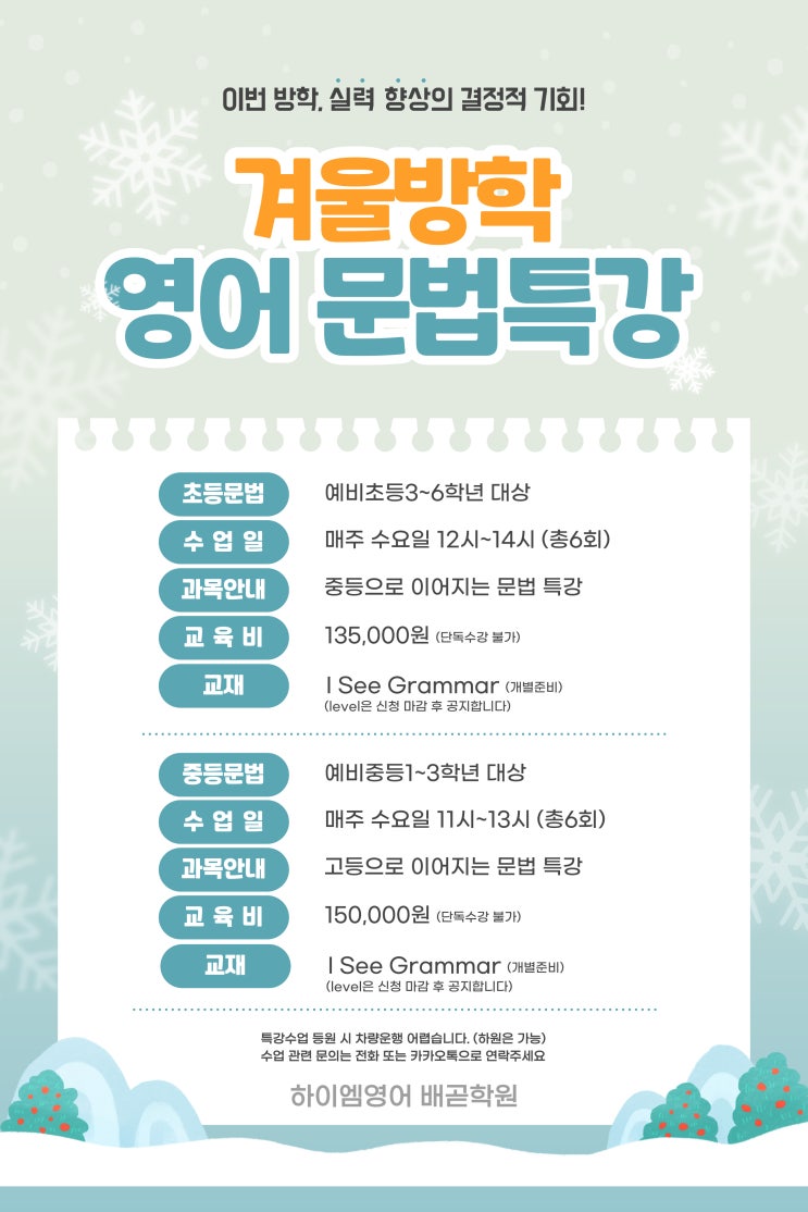 안녕하세요 하이엠 배곧입니다 :) 이번 겨울 방학 영어 수학 특강 안내입니다! 이미 마감이 되었지만,,, 참고하실 수 있게 올려 봅니닷 (바쁨 바쁨 ;_;) 영, 수 모두 방학마다 알찬 특강이 열리니 많은 관심 부탁드립니다! 앗 그리고 그동안 저희 학원은 중등부만 특강을 열었는데 요번 겨울부터는 초등부도 1~3회씩 열었습니다 :) 우리 하이엠 학생들 남은 방학도 화이팅팅팅!!!♡ <img src="https://blogthumb.pstatic.net/MjAyNjAxMjdfOTAg/MDAxNzY5NDgxMzAxMzM2.xdxmBQlisvMH-jUrdax-p2R9SNZOi1yUZtW2GxsLCLog.PRcVQ6Fox2CpmkxytOnXP29QUxUb3XdIiM_R-NeYDJQg.JPEG/%C1%A6%B8%F1%C0%BB-%C0%D4%B7%C2%C7%D8%C1%D6%BC%BC%BF%E4_-001_%2831%29.jpg?type=s3" />