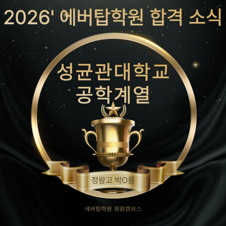 [정왕동수학학원][정왕동영어학원] 시흥 수험생과 학부모님 여러분 안녕하세요? Since 2011, 방향과 방법을 찾는 공간! 대입까지 함께 완주하는 시흥 대표 초·중·고 영어 수학 전문 정왕동 영어학원, 정왕동 수학학원 에버탑학원 정왕 캠퍼스입니다. 오늘은 고된 수험 생활 뒤에 맺게되는 너무나도 소중한 결실인 대학교 합격 소식을 전하려고 합니다. 수업과 학생 면담으로 바쁜 방학을 보내다보니 뒤늦게 기쁜 소식을 전하게 되었습니다. 벅찬 합격의 기쁨을 전해온 학생은 이번에 정왕고등학교를 졸업하고 성균관대학교 공학계열 26학번 새내기가 된 박O름 학생입니다! 2026' 성균관대학교 공학계열 합격 박O름 (정왕고등학교) 박O름 학....... <img src="https://blogthumb.pstatic.net/MjAyNjAyMjdfMjE4/MDAxNzcyMTI2MzA3NTM1.w6H5MtlcmbtA0JLJ4bSsB3nFVjDsbDPUmBA5Rvpt66Qg.0gHtV8pOOHO8-cyO5gLYUj7O6tZuOuQA4_kvnKWuZgYg.PNG/1.png?type=s3" />