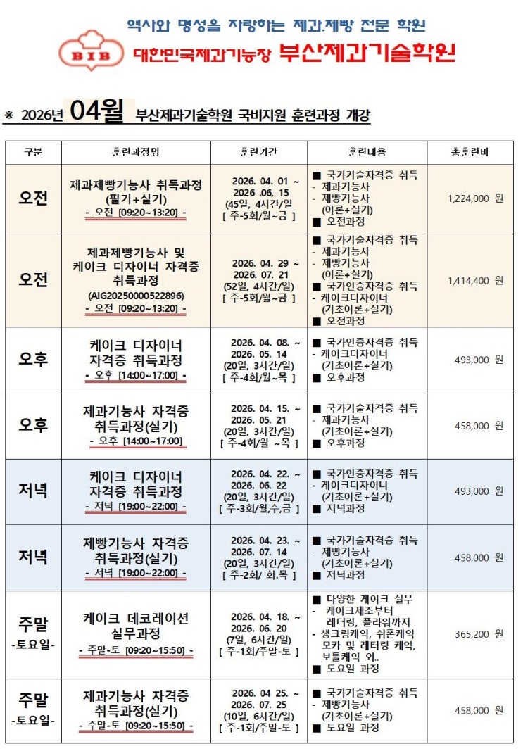좋은 하루입니다. 부산제과기술학원 [ 부산제과제빵기술학원 ] 입니다. 아직은 아침 저녁으로 기온차가 만만치 않게 춥네요. 환절기에 모두모두 건강에 유의하시구요.,. 26년 4월 국비지원 내일배움카드 훈련과정 개강안내 합니다. 조금은 많은 과정이 개강예정입니다. 오전, 오후, 저녁, 주말 과정을 꼭 확인해주세요. 저희 부산제과기술학원의 훈련과정 총 훈련비는 재료비를 포함한 모든 훈련비입니다. 상세과정소개 및 신청은 – 고용24 – 직업 능력 개발 – 개인 로그인 https://www.work24.go.kr/cm/main.do 검색창에 통합검색 또는 직업훈련검색을 체크하시고 검색창에 부산제과기술학원을 입력 검색후 검색결과에사 [ 훈련 ] 을 클릭하....... <img src="https://blogthumb.pstatic.net/MjAyNjAzMTFfNCAg/MDAxNzczMjIzNzYyODk3.I6E8OaKmTbw4gUccwTFdKFVCqMoJVVhL5NQrHNuB394g.zlD15r4GSCF46eq8KNiLJ00cBA_7XjYcU_GesTBBynog.JPEG/26%B1%B9%BA%F1%C8%C6%B7%C3%B0%FA%C1%A4%BE%C8%B3%BB2604001.jpg?type=s3" />