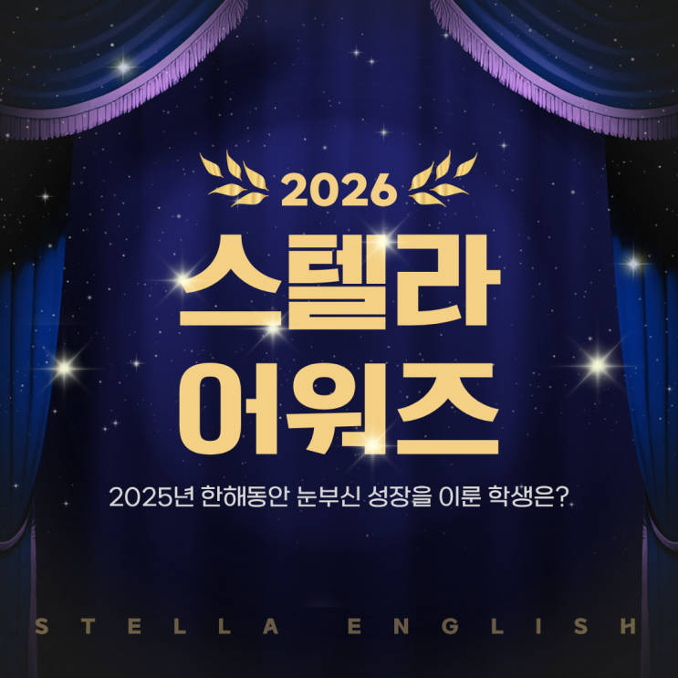 2026 스텔라 어워즈, 우리 아이들의 빛나는 순간을 기록하다 안녕하세요, 스텔라 영어학원입니다 저희 스텔라 영어학원에서는 매년 한 해를 마무리하며 아이들의 노력을 축하하는 특별한 시간을 갖고 있습니다! 바로 스텔라 AWARDS 시상식이에요 올해도 어김없이 학부모님과 학생들이 함께 모여 따뜻하고 의미 있는 시간을 보냈는데요 아이들이 1년 동안 흘린 땀과 노력, 그리고 그 과정 속에서의 성장까지 모두 담아내고 싶어 선생님들이 직접 정성껏 준비한 자리였어요! 아이들의 미소와 함성 그리고 따뜻한 격려의 박수가 함께했던 그날의 현장 지금부터 소개합니다~ 스텔라 어워즈, 현장을 소개합니다! 이번 어워즈에서는 시상식 느낌이 더욱....... <img src="https://blogthumb.pstatic.net/MjAyNjAyMjZfMTcy/MDAxNzcyMDk5ODUyNjgx.anc6tfAYCB0zZ6FJqKHDWl61D5knARma6sNER5my8L4g.rt8-MH0bVJwl2d79cvvpS6TyZZYNf8dqG7oqKKzkt3Yg.PNG/%C1%A6%B8%F1%C0%BB_%C0%D4%B7%C2%C7%D8%C1%D6%BC%BC%BF%E4._-_2026-02-26T185723.211.png?type=s3" />