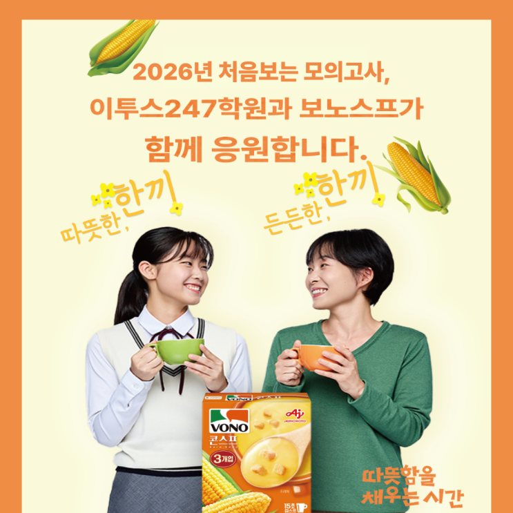 #목동이투스247학원 #목동재수학원 #목동독재학원 #대성더프리미엄모의고사 #3월모의고사 #3월학평 #모의고사이벤트 #보노콘스프 #수험생간식 #목동학원 #수험생응원간식 #수험생이벤트 #재수학원 #독학재수학원 보노 콘스프로 전하는 따뜻한 한 끼 안녕하세요 목동이투스247학원입니다. 3월은 수험생들에게 중요한 시기입니다. 실력을 점검하고 앞으로의 학습 방향을 확인할 수 있는 대성 더 프리미엄 모의고사가 진행되기 때문입니다. 목동이투스247학원에서는 3월 17일 대성 더프리미엄 모의고사를 응시하는 학생들을 위해 작은 응원 이벤트를 준비했습니다. 보노 콘스프 응원 이벤트 모의고사 당일, 열심히 공부해 온 학생들이 조금 더 따뜻....... <img src="https://blogthumb.pstatic.net/MjAyNjAzMTNfMTgy/MDAxNzczNDAwMjIyNjU0.dhzGcxPcG0TDYu1XNyfY6VzvGtRRwP4I_qjyw7mNNQUg.M4Ilk1GStBoScCDP4hLttXSzP7ScFKZKLqtZiB4EXMcg.PNG/%C1%A6%B8%F1%C0%BB_%C0%D4%B7%C2%C7%D8%C1%D6%BC%BC%BF%E4._%287%29.png?type=s3" />