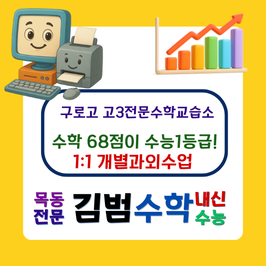 처음 상담 당시 천**학생의 수학 점수는 68점이었습니다. 개념은 어느 정도 이해하고 있었지만 계산 과정에서의 실수와 문제 적용 과정의 흔들림으로 점수가 안정되지 않는 상황이었습니다. 저는 구로고전문수학교습소에서 학생의 학습 상태를 먼저 분석하고, 반복되는 실수의 원인을 체계적으로 점검하는 지도부터 시작했습니다. 수학점수가 68점인 천**학생이 쌤과 수업후 3월 모의고사에서 2등급이 되었고 수능에서는 목표인 1등급을 받음, 실수의 원인을 체계적으로 점검해 반복되는 오류를 줄이고, 약한 개념은 집중적으로 학습하며 부족한 부분을 강화했습니다. 또한 EBS 연계 문제를 다양한 방식으로 풀어보며 개념 활용 능력을 키우고, 실....... <img src="https://blogthumb.pstatic.net/MjAyNjAzMTNfMjU4/MDAxNzczMzk5Mjg2NzEx.8hj9tmtIpPX-p8kR2B5t2fA_rv4kZeS3F07EDmW6N6Ug.5qC_b9Zjk__8pvtJYx4FDv7pE23Coupb0ehwXSR_r44g.PNG/1.png?type=s3" />