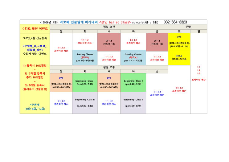 라보떼 전문발레_26년 4월 성인 발레 클래스(수업 시간표)