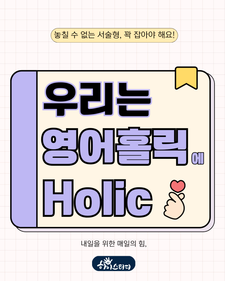 안녕하세요, 내일을 위한 매일의 힘, 하이스터디의 성장코치 원장초이 입니다. 긴 겨울이 끝나가며, 방학동안 열심히 달려온 우리 친구들의 홀릭도 하나 둘씩 마무리 되어가는 책 들이 나오고 있어요~ 원장초이와 함께 하는 영어홀릭 수업은 금방 끝나버리는 수업이 아니예요. 꼼꼼한 플래너를 바탕으로 수 많은 스텝들을 거쳐야 한 과를 겨우겨우 끝낼 수 있기 때문이죠. 우리 친구들과 홀릭을 제대로 달려보기 위해 원장초이의 고심의 흔적이 고스란히 담겨있는 플래너예요 모든 친구들은 수업을 시작하자마자 플래너를 보며 내가 학습해야 할 부분을 확인해가며 오늘의 학습을 시작하고 혹은 숙제를 확인해가며, 과제를 진행해요. 나....... <img src="https://blogthumb.pstatic.net/MjAyNjAzMTlfMjIw/MDAxNzczODg3NDg2NjQx.CrkHhZ4DqOAaECF8iCn0ZqKD3RpZWb8dBG9CCaUfCoQg.c91j7FFpHIW2CnEHFszTq4g3UrbuULUFkdme005Bqnsg.PNG/%BA%B8%B6%F3_%C1%D6%C8%B2%BB%F6%C0%C7_%B9%CC%B4%CF%B8%D6%C7%D1_%BF%EB%B5%B7%B0%FC%B8%AE_%B2%DC%C6%C1_%282%29.png?type=s3" />