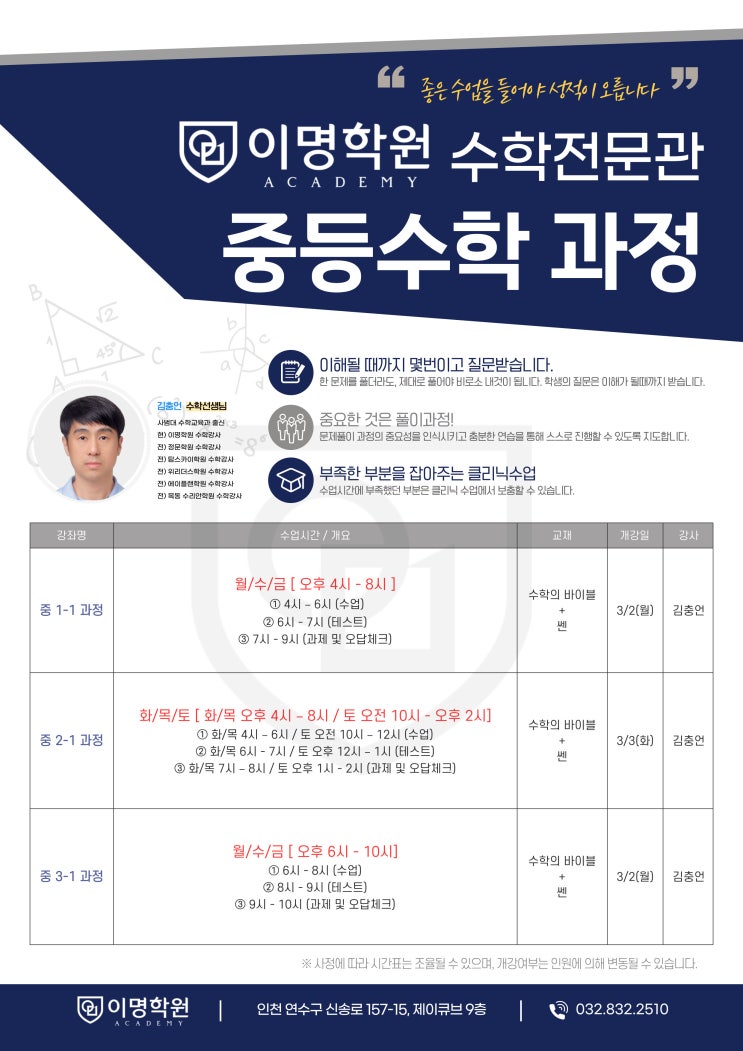 좋은 수업을 들어야 성적이 오릅니다. 새학기가 시작되고 어느덧 3월 중순 학생들 사이에서는 벌써 이해의 깊이와 문제 해결력의 차이가 나타나기 시작합니다. 같은 수업을 듣고 같은 문제를 풀어도 누군가는 스스로 해결해내고 누군가는 여전히 막히는 이유는.. ‘이해했다’고 느끼는 것과 ‘스스로 풀 수 있는 것’은 전혀 다르기 때문입니다. 이명학원 중등수학 프로그램은 이 차이를 만들어내는 핵심! 풀이 과정과 사고의 흐름에 집중합니다. 이 과정을 통해 배운 개념이 문제 풀이로 연결되고 문제 풀이가 다시 실력으로 이어지는 완전한 학습 구조를 만들어냅니다. 이명학원 수학 중등관 전담 김충언 선생님은 사범대학교 수학교육과 출신....... <img src="https://blogthumb.pstatic.net/MjAyNjAzMTlfMjcx/MDAxNzczOTA0MjUyMTM0.TWXqD-YcDPmmzPoTpAg9G2X6nMw0lxQIuf3_1IEFX5sg.6SLUqRditnh9vNFMe1N-ToMS3XdUOWpnirv6JlHh8t4g.JPEG/%A4%BA%A4%B7-001_%281%29.jpg?type=s3" />