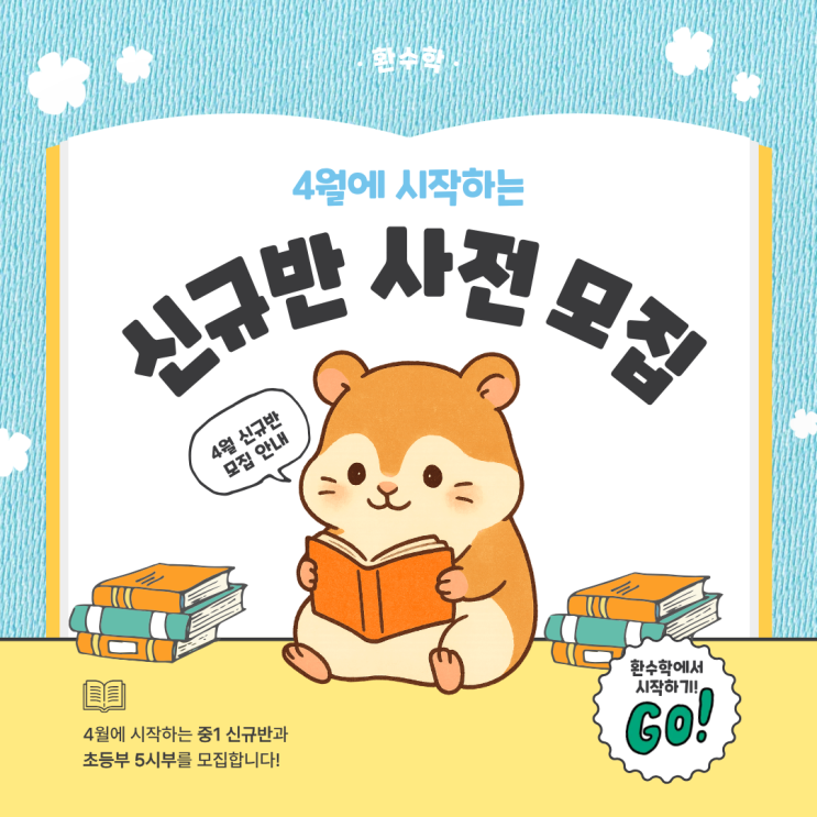 안녕하세요~ 환수학 입니다 환수학에서 4월에 신규반을 개설합니다!! 중1과 초등부 5시부를 대상으로 새로운 반을 4월부터! 시작할 예정입니다 4월 신규반 아이들 사전 모집에 대해 안내 드립니다! 먼저 중1반 신규반입니다! 중1반 신규반의 정원은 총6명입니다! 신규반은 화, 목, 토 수업을 진행할 예정입니다. 수업시간은 화,목 - 16:30 ~ 19:00 토- 11:30 ~ 14:00 입니다 중1 월수금수업도 궁금해하실 수 있는데요 중1 월수금반은 기존 반으로, 1명 추가모집 하고 있습니다! 시간대는 월,수,금 - 18:30~21:00 수업 진행합니다 다음은 초등부 5시부 안내입니다! 초등부의 경우 학부모님들으ㅣ 5시부 개설 문의가 많았습니다 그래서 4월부터 초....... <img src="https://blogthumb.pstatic.net/MjAyNjAzMDVfNjEg/MDAxNzcyNzAzOTIzMzAy.crxIBsQd2GcnqhS3p2mtiTWK51CQt5LKmi2pzSAcPhsg.QQZeAesL73WV6_wnsuAKj4fmn4yzLsoeqP12N4OnZrIg.PNG/%C1%A6%B8%F1%C0%BB_%C0%D4%B7%C2%C7%D8%C1%D6%BC%BC%BF%E4..png?type=s3" />