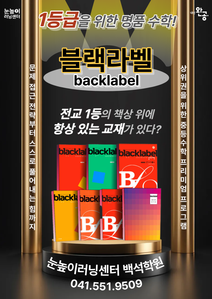 안녕하세요? 눈높이러닝센터 백석학원입니다. 중학교에 들어서면서 “수학이 갑자기 어려워졌다”는 이야기를 상위권 학생들 사이에서도 자주 듣게 됩니다. 문제를 못 풀어서가 아니라, 생각해야 할 문제가 늘어나기 때문이죠. 내신에서 마지막 한 문제까지 놓치고 싶지 않은 학생들을 위해 내신완공 블랙라벨을 소개드립니다. ✏️내신완공 블랙라벨 최상위권을 위한 수학은 따로 있습니다. 솔직히 말씀드릴게요. 이 프로그램은 모든 학생을 위한 수학이 아닙니다. ✔ 기본 개념이 이미 잡혀 있고 ✔ 학교 시험에서 상위권을 유지하고 있거나 ✔ “한 문제를 더 깊게 생각하는 수학”이 필요한 학생 그런 학생을 위한 프로그램입니다. 최상....... <img src="https://blogthumb.pstatic.net/MjAyNjAyMDRfMTAz/MDAxNzcwMTkzMTkyNjQx.6hJcWUjzE_j4G9k-Lw3v4uhJ_Up_qtj67xsc89hT2ukg.-n6QrxJEm9mUwra-MHF96ZCrGA-_LaAfgKC5n8Hx4HIg.PNG/3_%282%29.png?type=s3" />