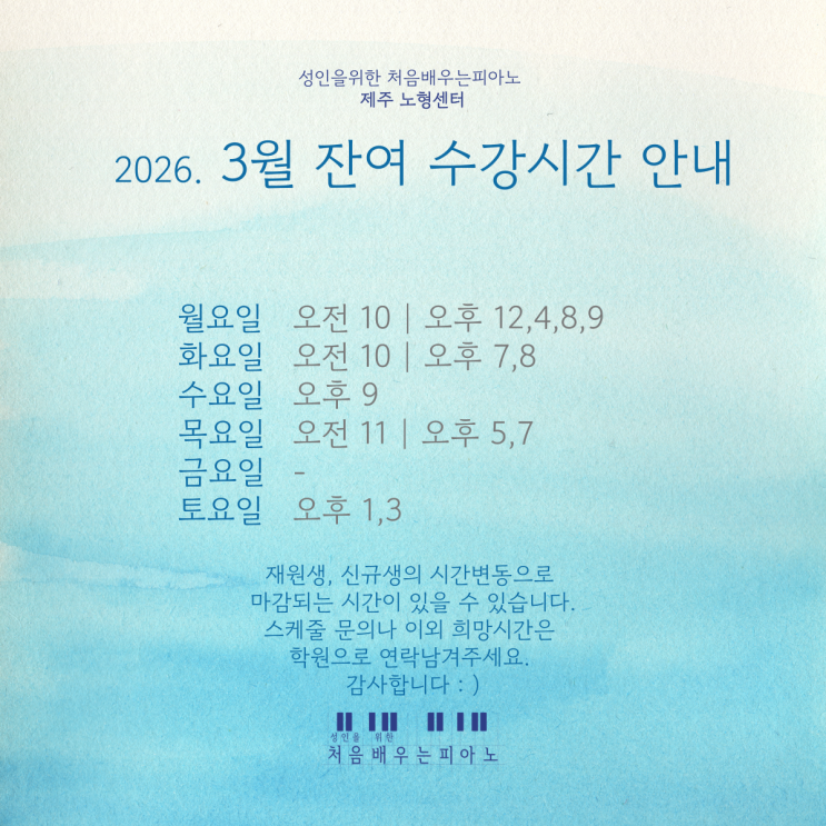안녕하세요, 처음배우는피아노입니다 3월 레슨이 대부분 마감되어 현재 수강 가능한 잔여 시간 안내드립니다. 잔여 시간은 소수로 운영되어 문의 순서에 따라 마감될 수 있습니다. 레슨을 희망하시는 분들은 편하게 문의 주세요 따뜻한 봄과 함께 피아노 시작해보세요 4월 수강 대기 등록도 함께 받고 있습니다. 원하시는 시간대가 있으시면 미리 문의 주세요 : ) 감사합니다 ! <img src="https://blogthumb.pstatic.net/MjAyNjAzMTlfMTI2/MDAxNzczOTIxMjI1NTU0.xNkoqXXNk_sNw17aTxCFa-b8HblT5pAXLc5WzrX4Esgg.vvfJXdUym8v5S9y4tM1zcJ9reNySqaxquKoqa1aSGjAg.PNG/003.png?type=s3" />