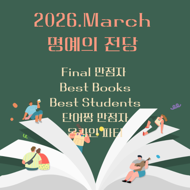 제주영어학원 북노형지앤비어학원에서는 한달동안 교재를 깨끗이 쓴 친구들에게 베스트 북 상을 주고 있어요. 이달의 베스트 북 친구들 모두모두 축하합니다. 또 북노형지앤비어학원에서는 매달 한달동안 수업태도가 좋았거나 많은 향상을 보인 친구들을 베스트 학생으로 선정해서 격려해주고 있어요. 이달의 베스트 학생들 축하축하합니다. 또 북노형지앤비어학원에서는 한달동안 온라인 숙제를 열심히 한반은 온라인 파티를 하고있어요 . 온라인을 열심히 하면 영어 실력이 쑥쑥 올라가요. 이번달은 3반이 온라인파티를 하지만 다음달에는 모든반이 온라인 파티를 할수있었으면 좋겠어요. 파티하는 우리들의 행복한 표정 보이세요? 또 북노형지....... <img src="https://blogthumb.pstatic.net/MjAyNjAzMjBfMTYg/MDAxNzczOTg2MzU2NDUw.taKbmY0i1LxLxVq56rUF8bQQX9VorN--q5IIYnX_KiMg.PPjjvsgFAQzdqxe5CVKx8c_FupgMpAsL-zTFvHZ-4rAg.PNG/900%A3%DF%C1%A6%B8%F1%C0%BB%A3%AD%C0%D4%B7%C2%C7%D8%C1%D6%BC%BC%BF%E4%A3%DF%A3%AD001%A3%A856%A3%A9.png?type=s3" />