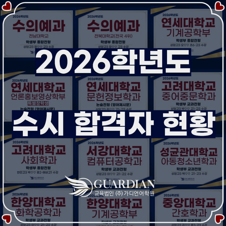 "학군지가 아니어도 됩니다. 제대로 된 준비가 답입니다." 대치동이 아닙니다. 특목고도 아닙니다. 가까이 일반고 학생들이 해낸 일입니다. 비학군지에서 입시를 치르는건 막막한 고군분투처럼 느껴집니다. 주변에 자극받을 친구도, 정보도 부족하게 느껴질 때가 있습니다. 그래서 저희는 더 전략적으로, 더 단단하게 준비했습니다. 1학년 때부터 흔들림 없이 쌓아온 내신 논술전형에까지 흔들리지 않은 기본기 수능 최저까지, 마지막 순간에도 놓지 않은 집중력. 주요 과목의 단단한 기본기와 내신, 논술, 수능을 아우르는 올라운더 학습 그것이 비학군지 일반고 학생들에게 가장 현실적인 무기였습니다. 학생부 중심 평가가 강화되는....... <img src="https://blogthumb.pstatic.net/MjAyNTEyMjZfMjE4/MDAxNzY2Njk5OTAyMDc4.hq1BeaF8YvbUH0zUgqYIpXbDX8xroRCsbE1gNyaNR2og.XC0jkC-I1-cS_eSGaIdyuuT9FsnCs80Eyo-cT9ICDnog.PNG/%C7%D5%B0%DD_%BD%E6%B3%D7%C0%CF_%281%29.png?type=s3" />