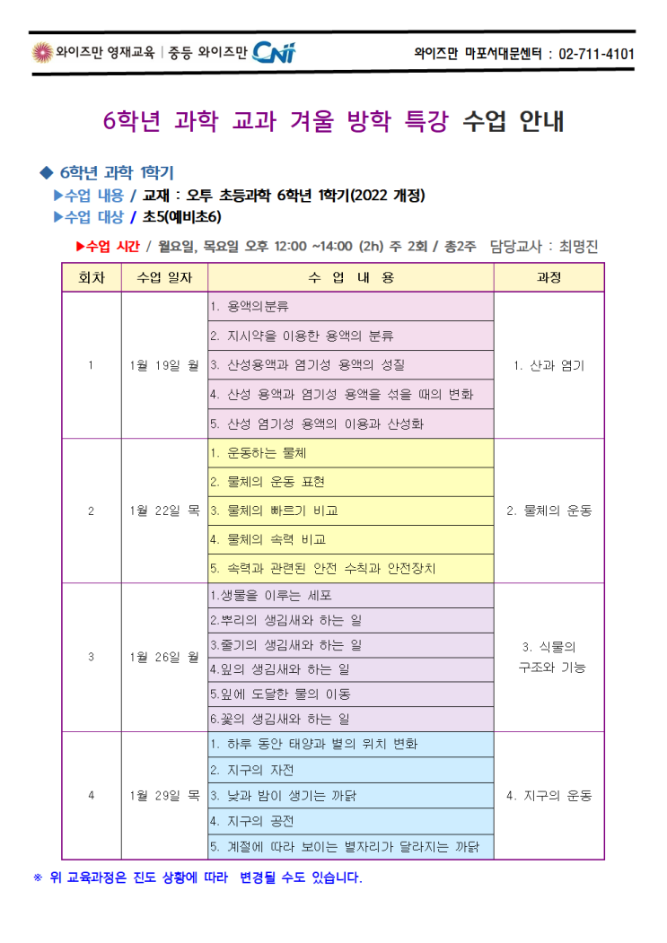 안녕하세요~ 마포센터입니다! 2026년 초등학생의 최고 학년, 6학년이 되는 친구들에게~ 과학개념을 확실히 다질 수 있는 특강이 준비되어 있어요! 나라가 부강하려면, 기초 과학 & 과학 기술이 중요합니다!! 긍지와 자신감에 근거 있는 과학 개념까지 갖추어 보아요 ^^ 문의 및 신청 02 - 711 - 4101 지하 주차장 2시간 무료 감사합니다 ^^ #와이즈만마포센터 #초등과학 #방학특강 #과학개념 #과학사고력 #창의적문제해결력 <img src="https://blogthumb.pstatic.net/MjAyNTEyMjVfMjkw/MDAxNzY2NjQzMjQ4ODc4.etQcM8zeHTLiCPmHCJw3QVUoGP87NlGPRPeveWGXUNcg.xw13isafZr2fFJtOa40zywTzZicfEnICYHR1FbhC-t0g.PNG/2026%C7%D0%B3%E2_%B0%DC%BF%EF%B9%E6%C7%D0_%C3%CA6%B1%B3%B0%FA_%C6%AF%B0%AD001.png?type=s3" />