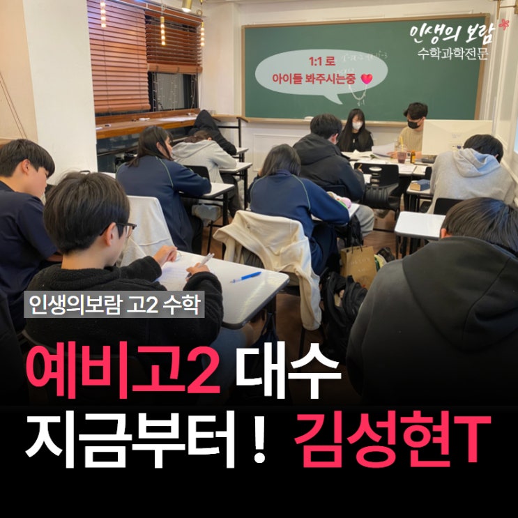 안녕하세요 인생의보람 수학과학 전문학원 본원입니다. 성적을 올릴 수 있는 가장 좋은 기회는 겨울방학입니다!! 이제 예비고2 학생들은 더 어려워진 2학년 수학인 대수, 미적 그리고 일반선택과목까지 공부하게 되는데요. 예비고2 학부모님들께서도 잘 아실 거예요. 좋은 퀄리티의 수업은 물론 반드시 학생 개개인에 맞는 관리가 붙어야 성적을 올릴 수 있습니다! 인생의보람 본원 김성현T는 이번 겨울방학부터 예비고2 대수 수업과 멘토수학을 맡고 있습니다. 학부모님들께서 우리 예비고2 아이들을 믿고 맡길 수 있도록 김성현T 학생 맞춤 관리 방법에 대해 설명드리려고 합니다 :D 집중해서 끝까지 읽어주세요 ^^~ 첫 번째는, 학교별, 수준별....... <img src="https://blogthumb.pstatic.net/MjAyNTEyMjZfMjMz/MDAxNzY2NzIwOTI5NDE2.eQc0FBJvnjJgGGltGKJqW-xv91jv457SCfbmgBB22Ywg.L4rUilgDH_x7CdwxmMwv-1gQAJCG_3fHG3INjcj9UA0g.JPEG/%C7%D0%BF%F8_%BA%ED%B7%CE%B1%D7%BD%E6%B3%D7%C0%CF_%B0%A1%C0%CC%B5%E5_%281%29.jpg?type=s3" />