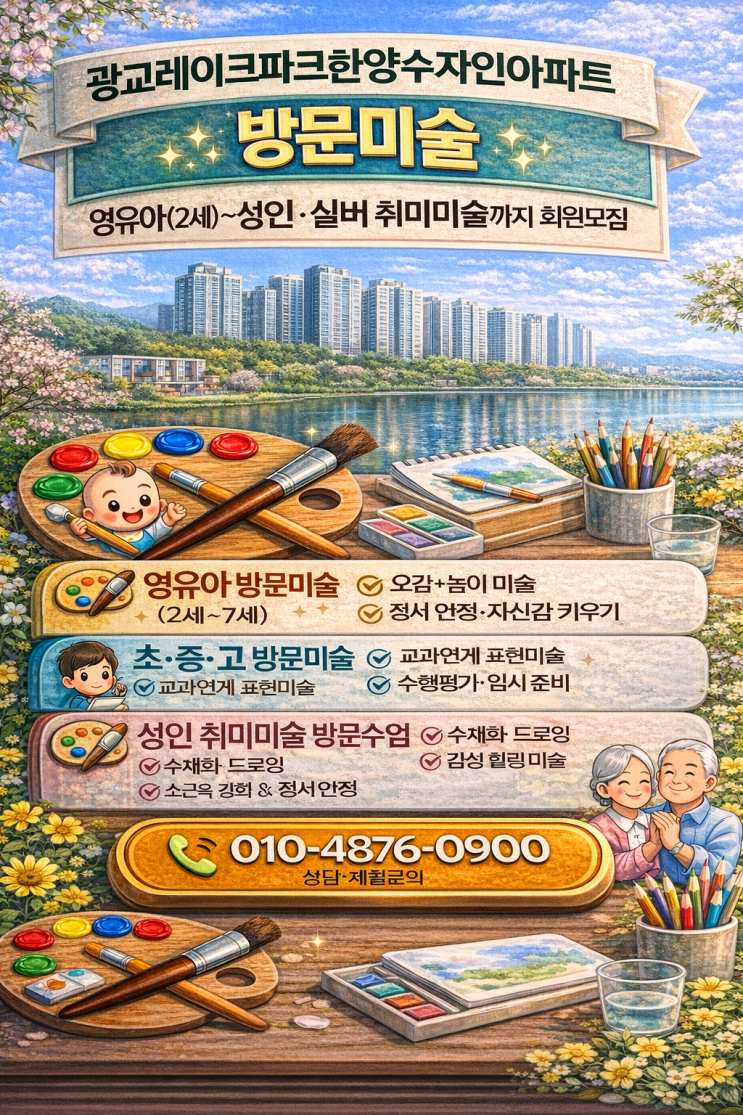 광교레이크파크한양수자인아파트에서 이제 미술학원 이동 없이 집에서 편안하게 배우는 방문미술을 시작하세요. 홍익아트 방문미술은 영유아(2세)부터 초·중·고, 성인 취미, 실버미술까지 연령별·수준별 맞춤 1:1 수업이 가능합니다. 수원 영통구 광교 방문미술 상담문의 010-4876-0900 영유아 방문미술 (2세~7세) ✔ 오감 자극 놀이 미술 ✔ 촉감·색채 탐색 활동 ✔ 정서 안정 · 자신감 형성 ✔ 표현력 기초 발달 2세부터 가능한 프로그램으로 놀이 중심 활동을 통해 자연스럽게 집중력과 창의력의 기초를 만들어드립니다. 이 시기의 미술은 결과보다 과정 속 경험과 감정 표현이 가장 중요합니다. 초등 · 중등 방문미술 ✔ 기초....... <img src="https://blogthumb.pstatic.net/MjAyNjAyMjJfMTAz/MDAxNzcxNzMyOTQzNzY4.DLN7SPatmPoM69BCO5LYt7ZS-jCLcGS0zQJxRA4Hfl8g.EDEe-CUxr8P2hcds81QK9RwvQXFqEWbAM68lI3puYDgg.PNG/%C8%AB%C0%CD%BE%C6%C6%AE%B1%A4%B1%B3%C7%D1%BE%E7%B9%E6%B9%AE.png?type=s3" />