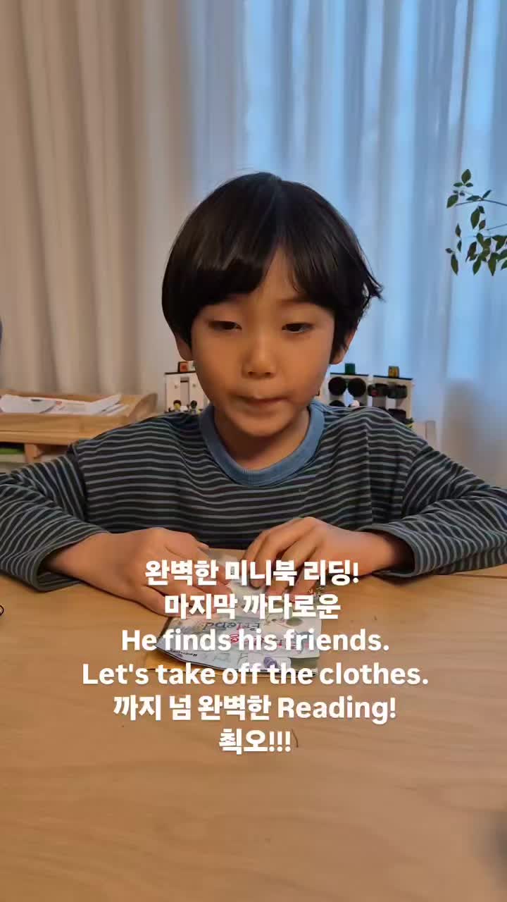 미니북 리딩 미션도 척척 해내는 이제 갓 7세 된 친구입니다! 완벽한 미니북 리딩! 마지막 까다로운 문장 He finds his friends. Let's take off the clothes. 까지 넘 완벽한 Reading! 쵝오!!! <img src="https://phinf.pstatic.net/image.nmv/blog_2026_02_24_1626/ZzvjcTtjpv_01.jpg?type=f480x480" />
