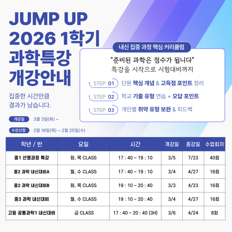 [수학과학교육전문] 점프업은 개념을 깊게 이해시키고 실력을 끝까지 끌어올리는 정교한 학습 설계와 관리 시스템으로 학생들의 '도약'을 만드는 학원입니다. [개념은 깊게, 실력은 높게, 점프업!] 초, 중, 고 내신완성 / 개인별 맞춤지도 전문 2026 1학기 과학특강 안내 안녕하세요 점프업수학학원입니다. 2026년 1학기 과학 내신 대비를 위한 과학 특강 과정 개강을 안내드립니다. 이번 과학 특강은 1학기 학습 내용의 핵심을 체계적으로 정리하고 학교 시험 대비까지 이어지는 과정으로 운영됩니다. 학습 밀도와 수업 집중도를 위해 학년별 소수 인원으로 운영되며 정원 내 선착순 접수로 진행될 예정입니다. 신청서는 카카오톡 채....... <img src="https://blogthumb.pstatic.net/MjAyNjAyMTlfMjg2/MDAxNzcxNDgwNTgwNjgy.Z_Vsq9m8uHMKh8kghQyRWedptJNw5Xn41rxsY3LbwhQg.wfLuGbX07rB7AO-DQYQKWKhn0DKJEE7rjJV3cvT8kucg.PNG/2026_1%C7%D0%B1%E2_%B0%FA%C7%D0%C6%AF%B0%AD.png?type=s3" />