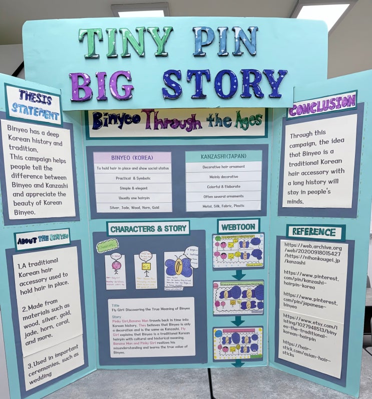 안녕하세요. 기본이 단단한 영어 워니영어전문학원입니다. 오늘부터 워니영어 아이들의 영어발표 프로젝트를 한 작품씩 소개합니다. 첫번째 팀은 정*미 (시곡초6) / 백*희 (시곡초6) / 김*현 (시곡초5) 비녀팀입니다. 이번 발표 프로젝트에서는 비녀와 일본의 장신구 칸자시를 비교하여 비녀를 한국의 고유한 장신구임을 알리는 내용을 담아 보았습니다. Thesis Statement(주장)부터 명확한 메세지 전달을 위한 비교 표를 작성하고 무엇보다도 듣는 사람들이 흥미를 가지고 쉽게 이해하도록 웹툰을 직접 제작하였습니다. 캐릭터 모습과 이름 그리고 스토리 라인까지 세명의 아이들이 머리를 맞대고 아이디어를 내고 일을 분담하고 다시 모여서 또....... <img src="https://blogthumb.pstatic.net/MjAyNjAzMTNfNDMg/MDAxNzczMzkxMzkwMDY5.53GMs1ieyD5m0ACJlFAZ0kDsDuTziE1w4nX-txUVq7cg.Ielf5R34K_R_XMAGGmyymYOthzjr7N7Sy739YVoLOcUg.JPEG/KakaoTalk_20260313_173819081_01.jpg?type=s3" />