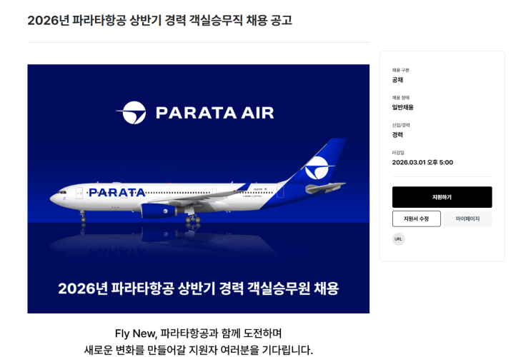 유현정강사 입니다. 파라타항공 경력직 승무원 채용 공고가 나왔습니다. 이것 때문에 신입채용 인원이 한기수였나봐요. 일단 경력직 승무원 채용도 파라타항공은 채용인원은 많은 편인데 지원해봐도 될 것 같습니다. 대부분 LCC 항공사는 4년이상, 5년이상 경력을 요구하는데 파라타항공은 대한항공과 같이 단 2년이상이면 경력직으로 지원 가능합니다. 현직들이 많이 지원해도 별 문제 없어 보입니다. 파라타항공 월급이 현재 진에어와 거의 비슷하다고 하죠. 괜찮다고 하는 반응입니다. 현직들 만족도가 높은 편이구요. 기내서비스 만족도도 높다고 해요. 다만 경력직이라도 영어스펙을 많이 보는 항공사라 어학증빙은 하는 것이 좋을 것 같습....... <img src="https://blogthumb.pstatic.net/MjAyNjAyMTVfMjgg/MDAxNzcxMTI1MjY1MTQ4.JXIpqnsQ85X67DZqIsbQlMeewKgziKS6jZr9Ml9CqKUg.NZ1TRALxhi5BN8gDY5hx5yK1RbTLgZxDAqO00Jr-TiAg.PNG/2026-02-15_12%3B13%3B35.PNG?type=s3" />