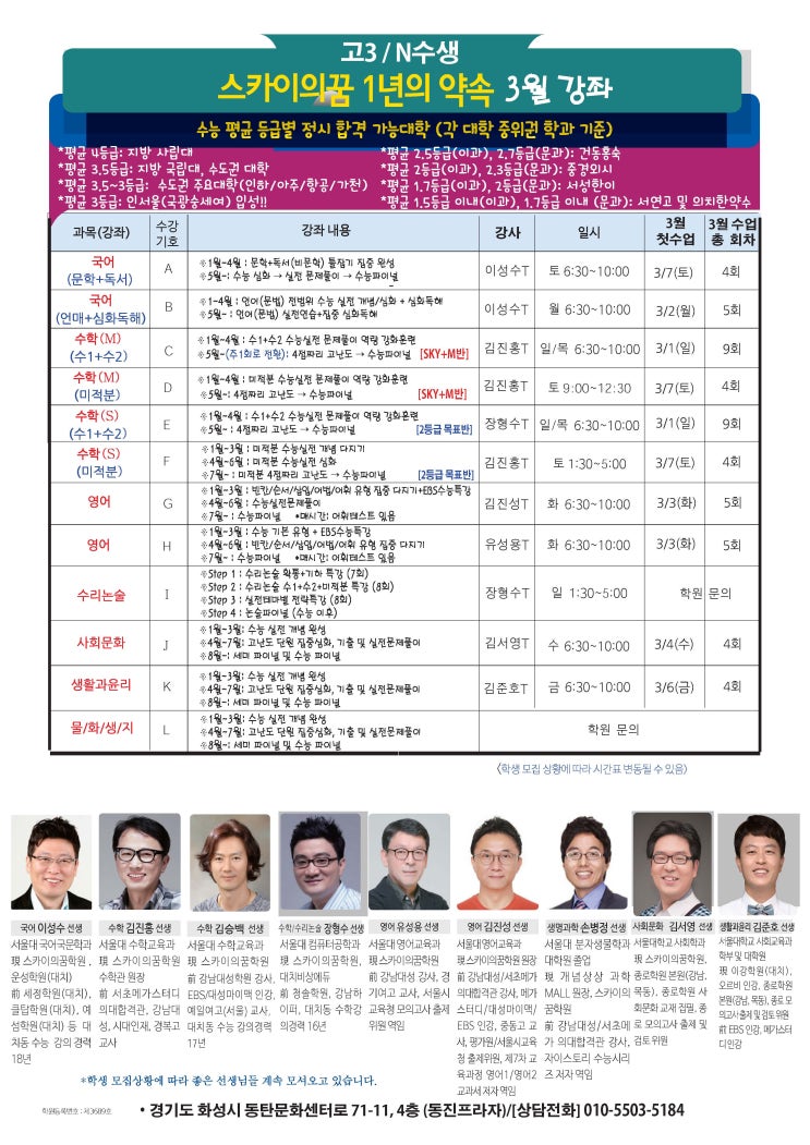 동탄 수능전문 스카이의꿈학원 3월 시간표 안내(고3및N수생)
