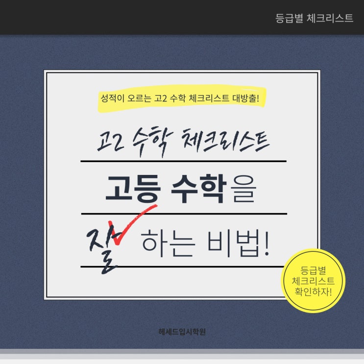 안녕하세요. 수학·국어 전문 헤세드 입시학원입니다. 오늘 헤세드가 준비한 입시정보는 "고2 수학, 성적 되살리는 실전 체크리스트~!"입니다! 고2 수학은 많은 학생들이 ‘포기선언’을 고민하는 분기점입니다. 노력해도 점수가 오르지 않는 3등급 학생, 개념이 엉켜 방향을 잃은 4등급 학생, 이미 자신감이 무너진 5등급 학생까지... 지금 필요한 것은 더 어려운 문제집도, 무작정 긴 공부시간도 아닙니다. 현실에 맞춘 전략과 ‘다시 시작할 수 있는 방법’입니다. 이 체크리스트는 고2 학생들이 현재 위치에서 다시 수학을 붙잡고, 작은 성공을 회복하며, 성적과 자신감을 동시에 되살릴 수 있도록 설계된 실천 가이드입니다. 멈추....... <img src="https://blogthumb.pstatic.net/MjAyNjAyMTRfMTY4/MDAxNzcxMDUxODEwMDE4.PDgwso4G__SJBnPFQwAnQ6vKlrEYeIc6yphgfHI9Wosg.LCSrzUdcH2aUtlWAQNG8aczmH9LOh2YYYbdPCxvRarYg.JPEG/%C1%A6%B8%F1%C0%BB-%C0%D4%B7%C2%C7%D8%C1%D6%BC%BC%BF%E4_-001_%281%29.jpg?type=s3" />