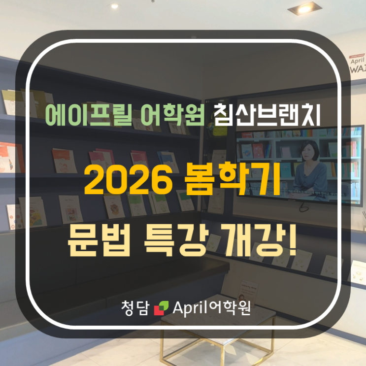 안녕하세요. 침산동 대표 영어학원 청담April어학원 침산브랜치입니다. 포근해진 봄날씨와 함께 우리 에이프릴 친구들도 더욱 밝은 모습으로 수업을 즐기고 있는 요즈음인데요, 침산브랜치에서도 학생들의 수업을 보충할 수 있는 특강을 준비하였습니다! 오늘은 4월부터 시작되는 봄학기 에이프릴 문법 특강에 대해 소개 드리겠습니다! ◆ 수강 일정 4월 7일(화)~5월 29일(금) 총 14회 * 5월 5일 (화), 5월 8일 (금) 휴강 ◆ 수업 시간 매주 화금 5:30~7:00(90분) ◆ 수업 대상 초등학교 4학년 이상(Sprout1 이상) 이번 문법 특강은 총 8주 과정 (총 14회) 으로 진행됩니다. 지난 겨울 학기에 진행된 특강보다 심화된 학습으로 진행되며, 기존에....... <img src="https://blogthumb.pstatic.net/MjAyNjAzMTlfMTAy/MDAxNzczODk5NTM4Mzgz.6n_tFUB8WwfajY6qZG2Iqm2grTVP6obAEc8nQRPYCzIg.Tc17lFz-3vlmdkl4DkVFQobs147PEKUDU93wuhNtUW0g.PNG/%BA%ED%B7%CE%B1%D7%C5%B8%C0%CC%C6%B2%28NEW%29.png?type=s3" />